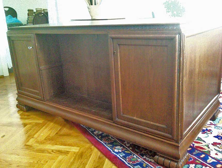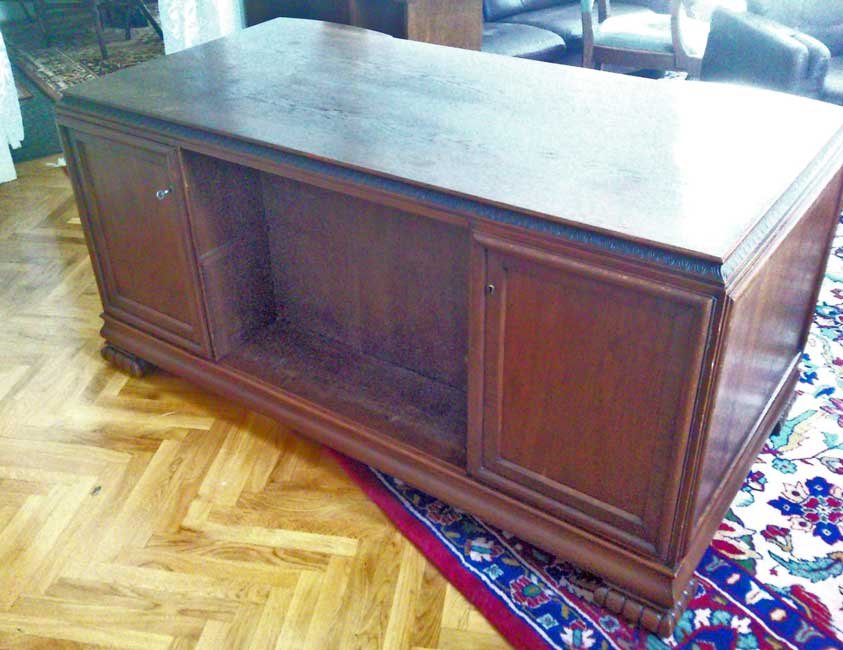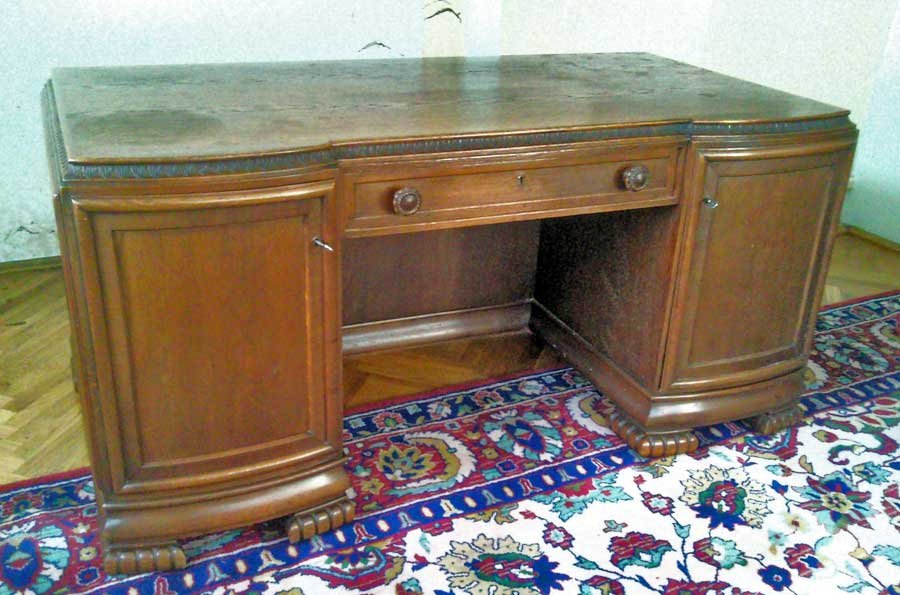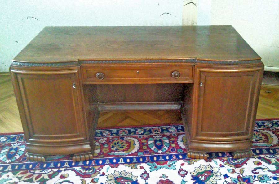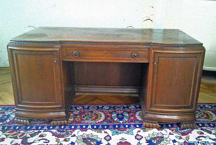 Großer Schreibtisch um 1910. Frei im Raum stellbar, rückseitig ebenfalls Türen und Regalfach. Vorderseitige Türen konvex geschwungen, oben umlaufende Schnitzkante. Innen mit Schubkästen und Böden.