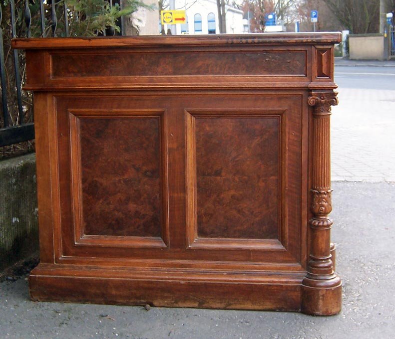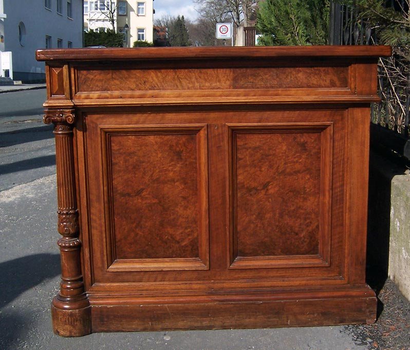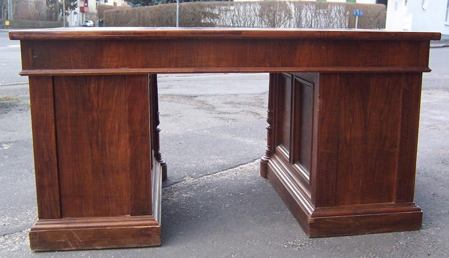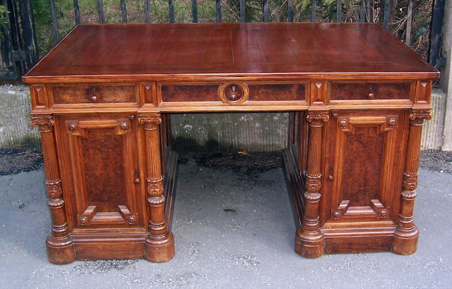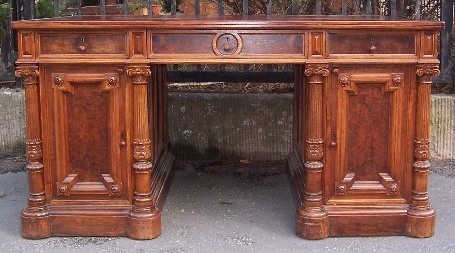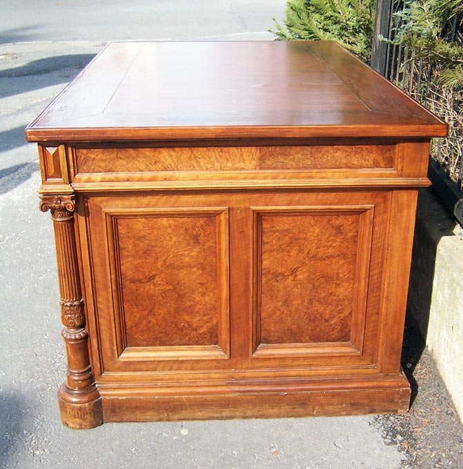 Repräsentativer Schreibtisch um 1880. Nussbaum- und Nusswurzelholz furniert. Oben drei Schubkästen, seitl. zwei Türen mit je 3 Schubkästen. Gestaltet durch vier Säulen und verschiedene Verzierungen. Allseitig gegliedert durch Kassettenfülllungen und profilierte Leisten, Füllungen in Wurzelholz. Frei im Raum stellbar durch furnierte Rückseite.