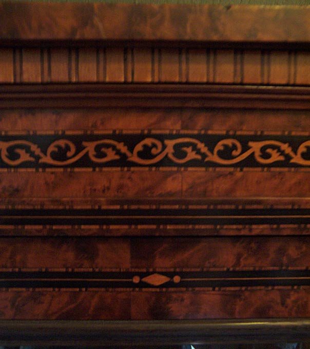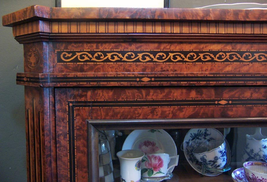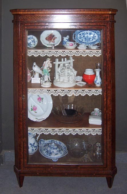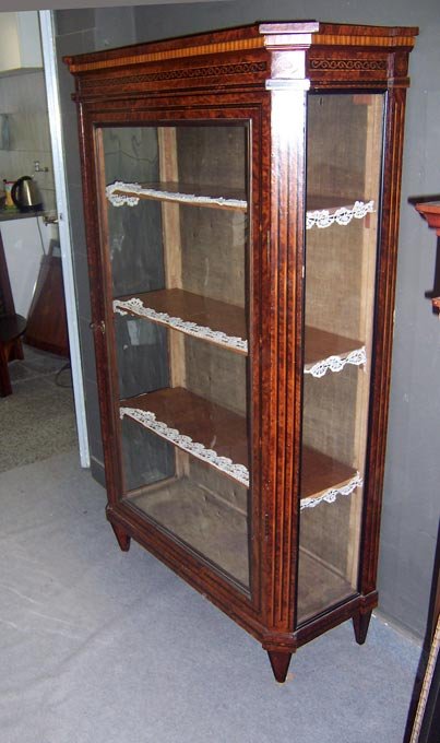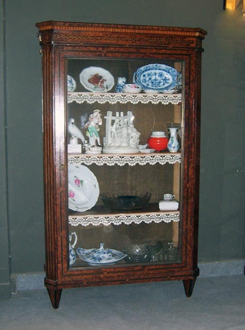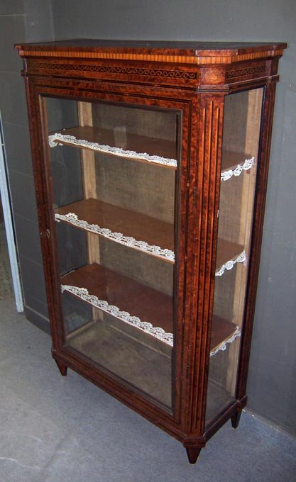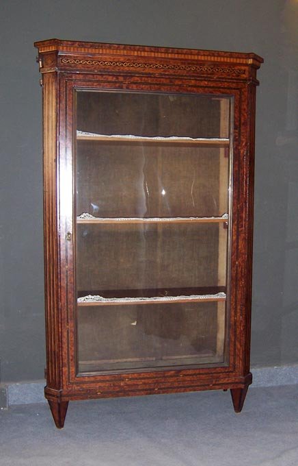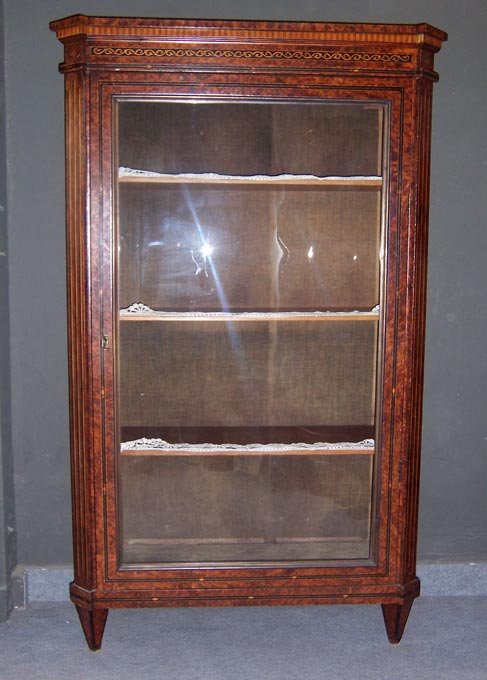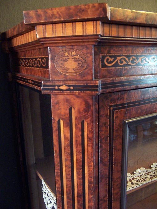 Durch Profile und Lisenen gegliederter Korpus. Tür und Seiten durchgehendes Glas, in der Tür in Messigleiste-, seitl. in ebonisierten Leisten gefasst. Lebaftes Wurzelfurnier, nußbaumfarbig. Reich mit verschiedenen aufwändigen Bandintarsien und Mänerband intarsiert. Intarsienfries als oberer Abschluß. Seitl. abgeschrägte Lisenen mit hell/dunkelen Bändern.