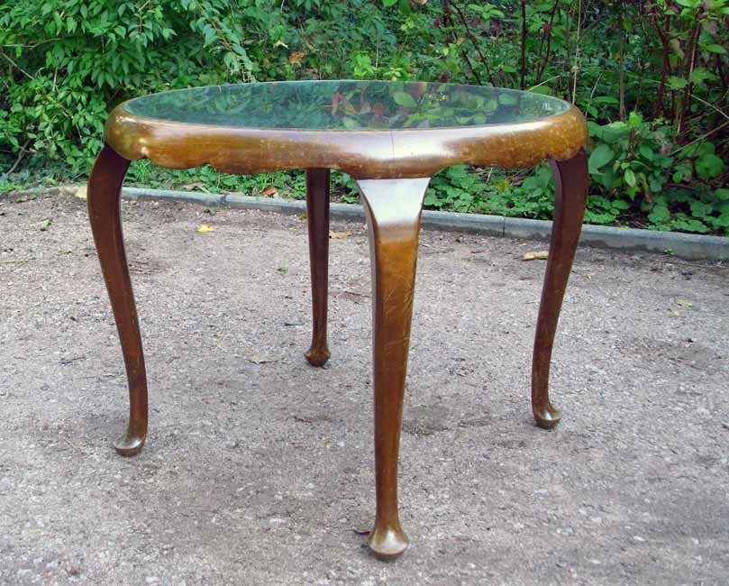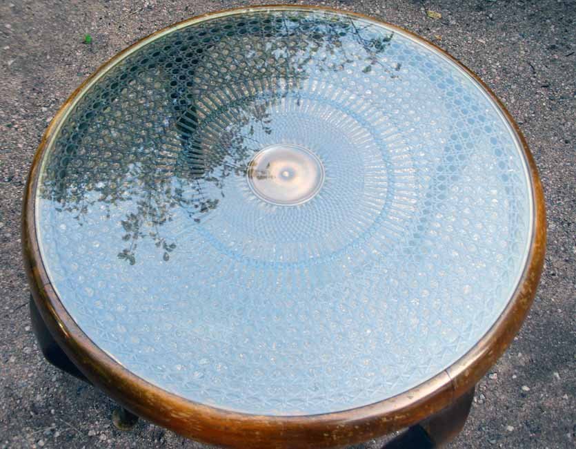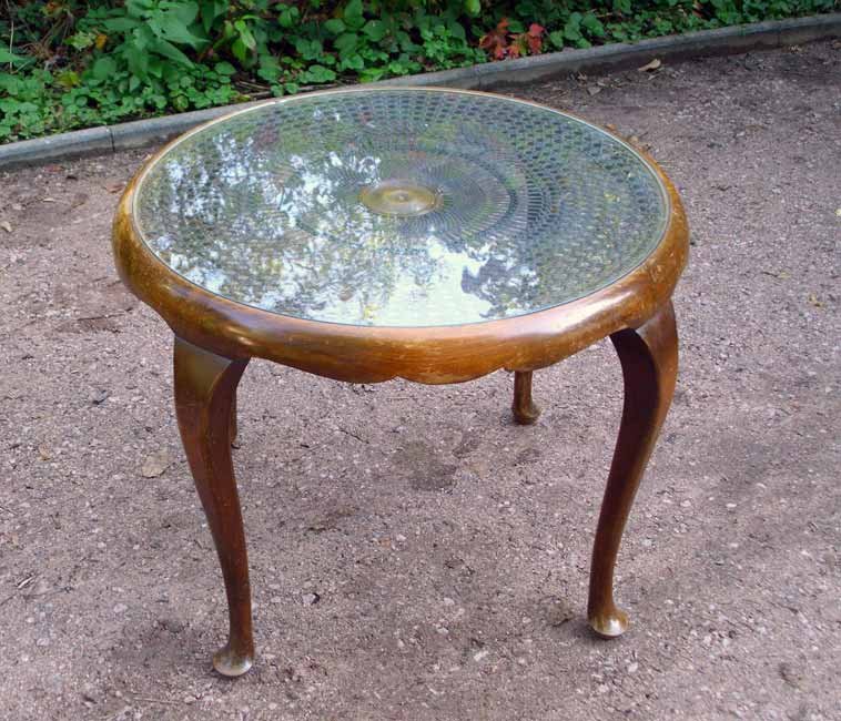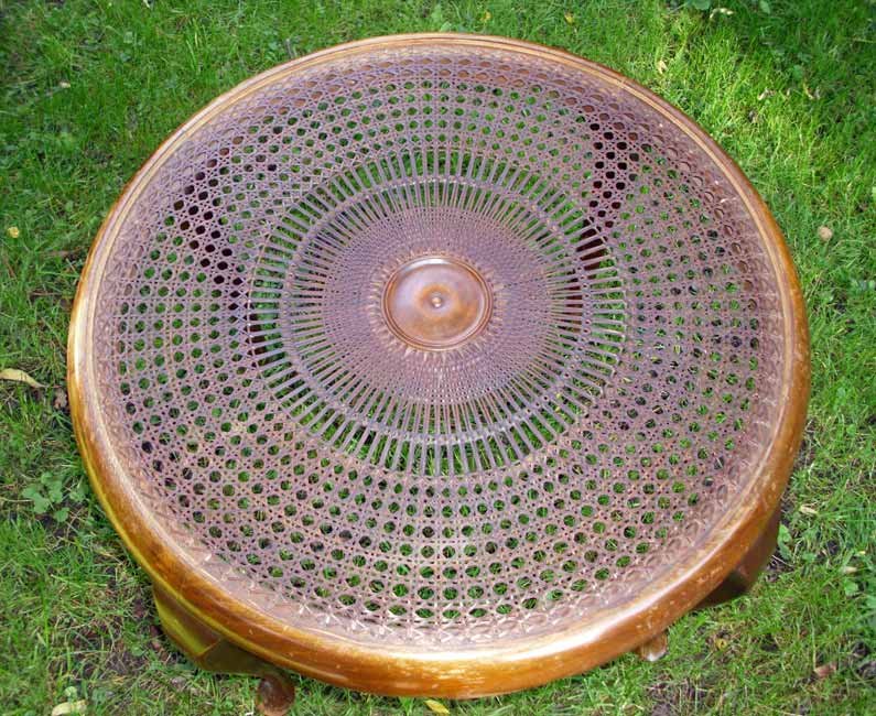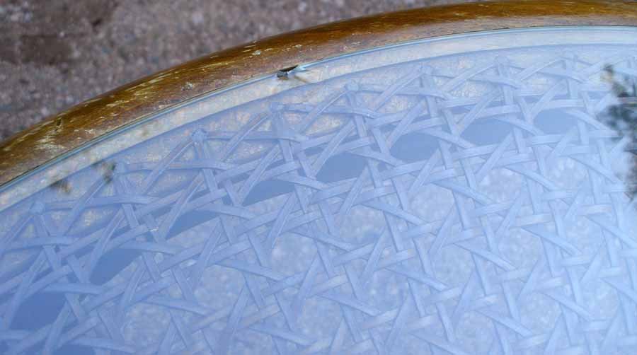 Runder Tisch, sogen. Chippendaletisch. Geflecht in rundem Rahmen mit Glasplatte.