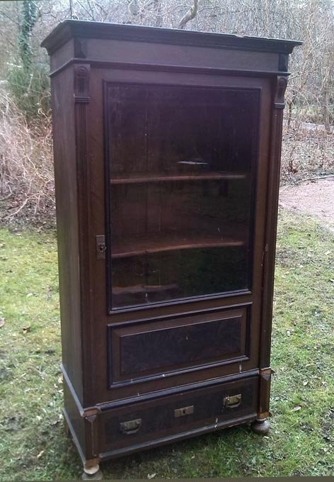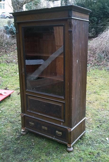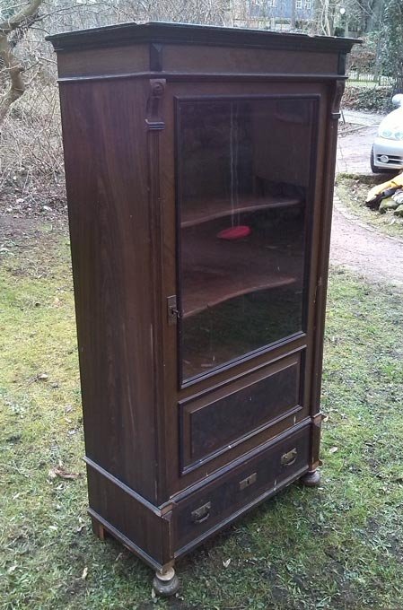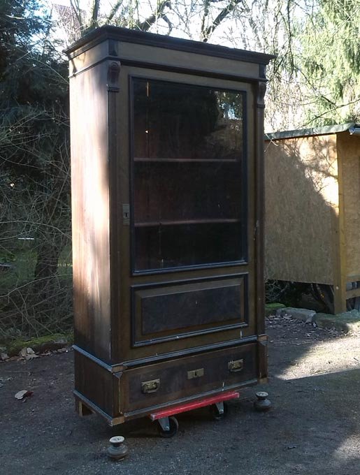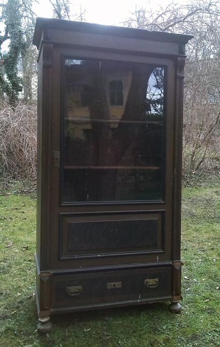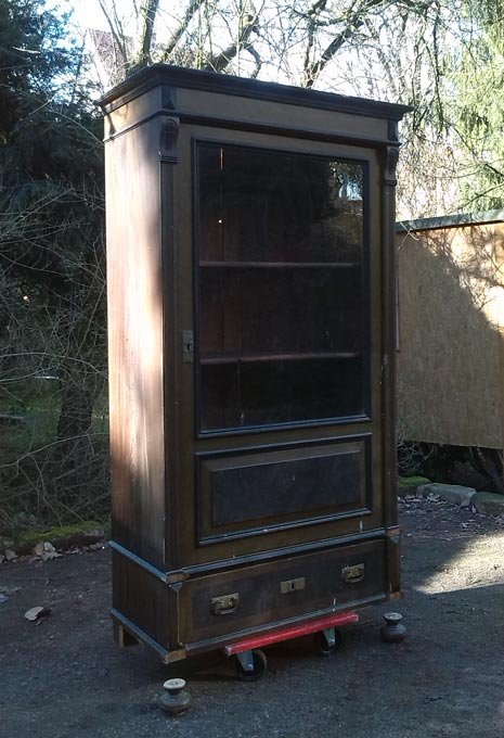 Weichholzschrank, eintürig mit Schubkasten. Tür im oberen Teil Glas, unten geschlossen.