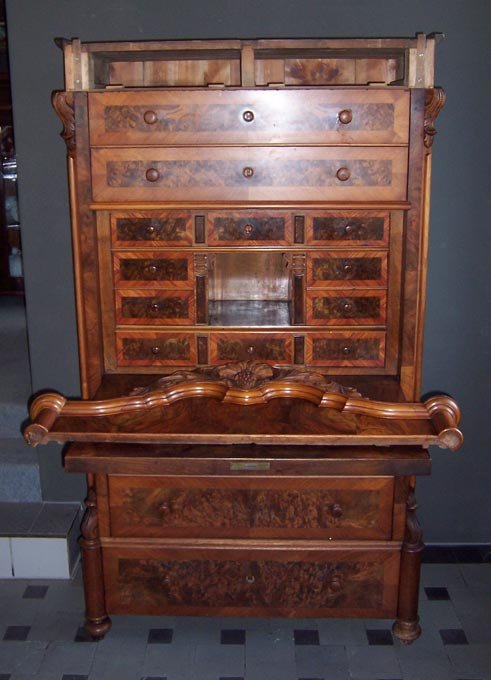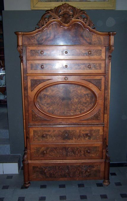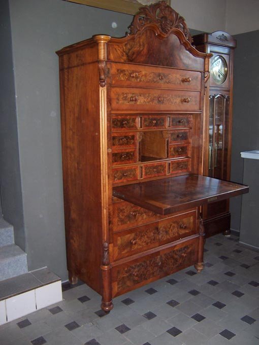 Reserviert!! Sekretär, Spätbiedermeier um 1860. Nuss und Nusswurzelholz furniert, geschnitzte Krone. Aufklappbare Schreibplatte, darunter 3 Schübe, darüber zwei Schubkästen. Hinter der Schreibplatte Inneneinrichtung mit kleinen Schubkästen. Geheimfächer hinter der abnehmbaren Krone.