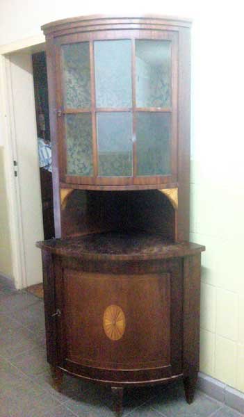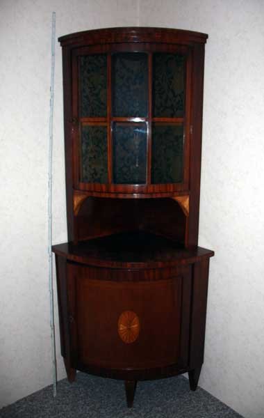 Eckschrank, Mahagonie furniert. Unterteil und zurückgesetztes Oberteil, je gerundete Front. Unten geschlossene Tür mit ovaler Fächerintarsie und Bandintarsie, Oberteil verglast. Eckaplikationen mit Fächerintarsien. H. 189, B. 85 cm