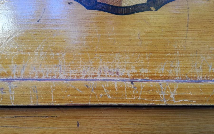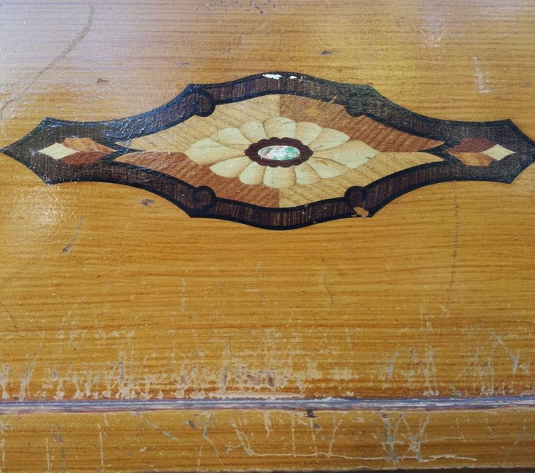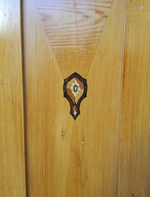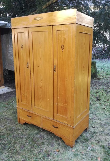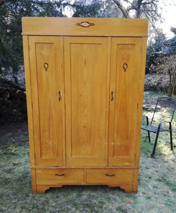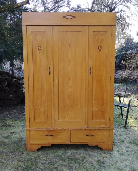 Dreitüriger Schrank um 1910, Weichholz. Zwei Schubkästen. Auf türen und Kopfteil aufgemalte Intarsien. Unrestauriert, solider Zustand mit orig. Furniermalerei, diese mit Gebrauchsspuren. Vollständig demontierbar.