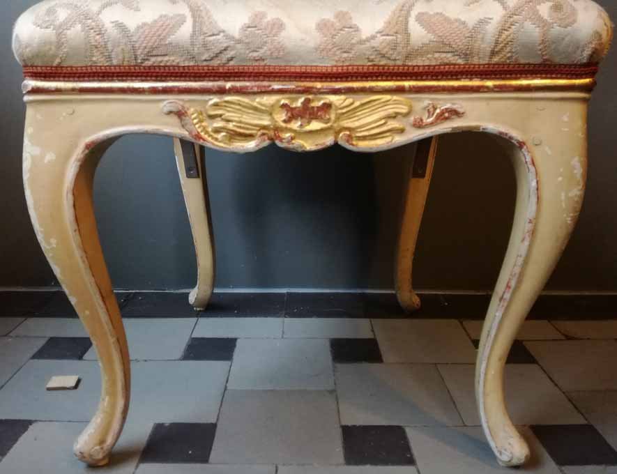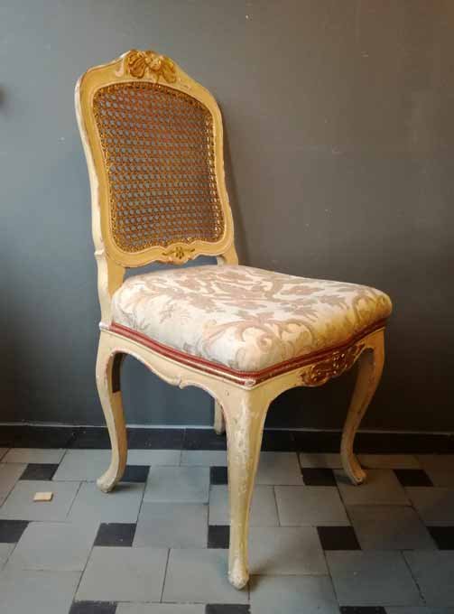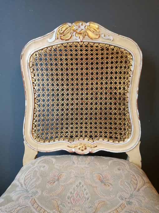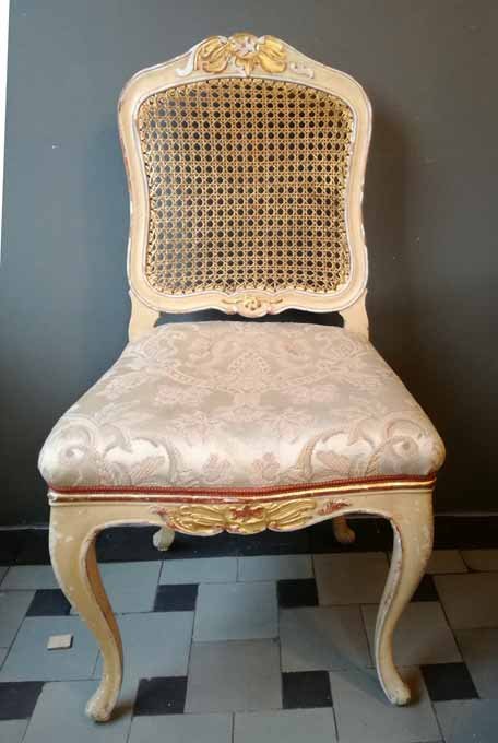 Originalzustand (außer Polster) Rückenlehne mit orig. Geflecht vergoldet, sehr gute Substanz. Restaurierungsbedürftig.