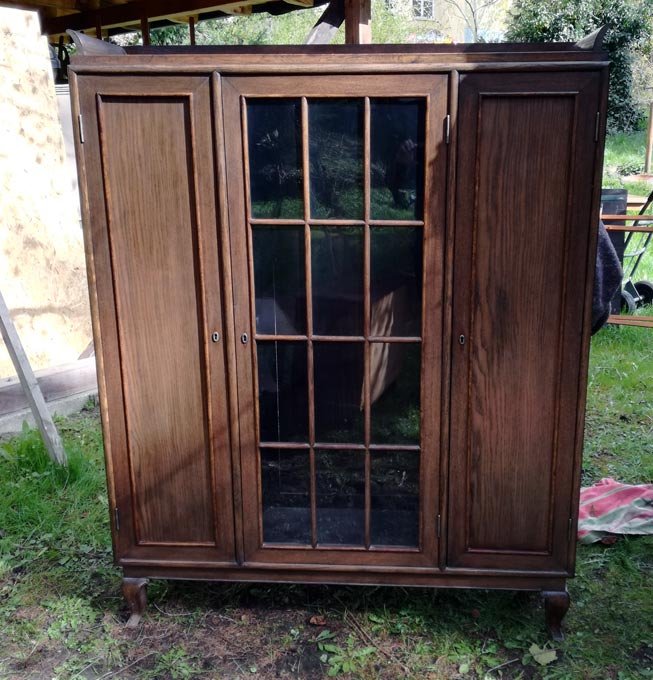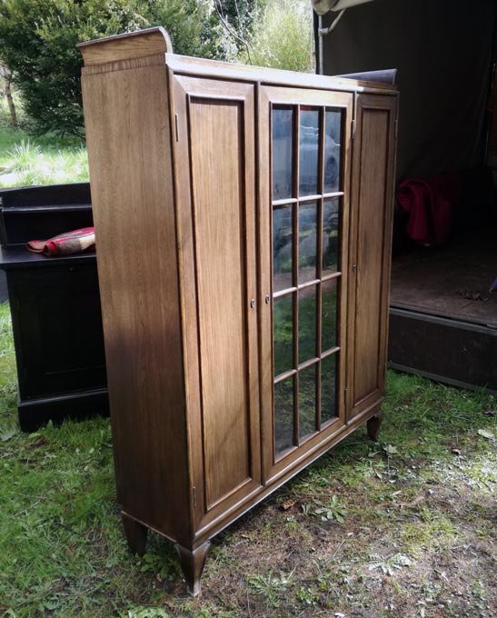 Zierlicher Bücherschrank mit geringer Tiefe von 35 cm. Eiche, dreitürig mit je mehreren, höhenverstellbaren Einlegebrettern. H.166, B.130, T.35 cm.
