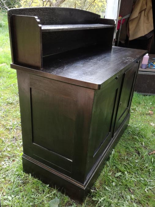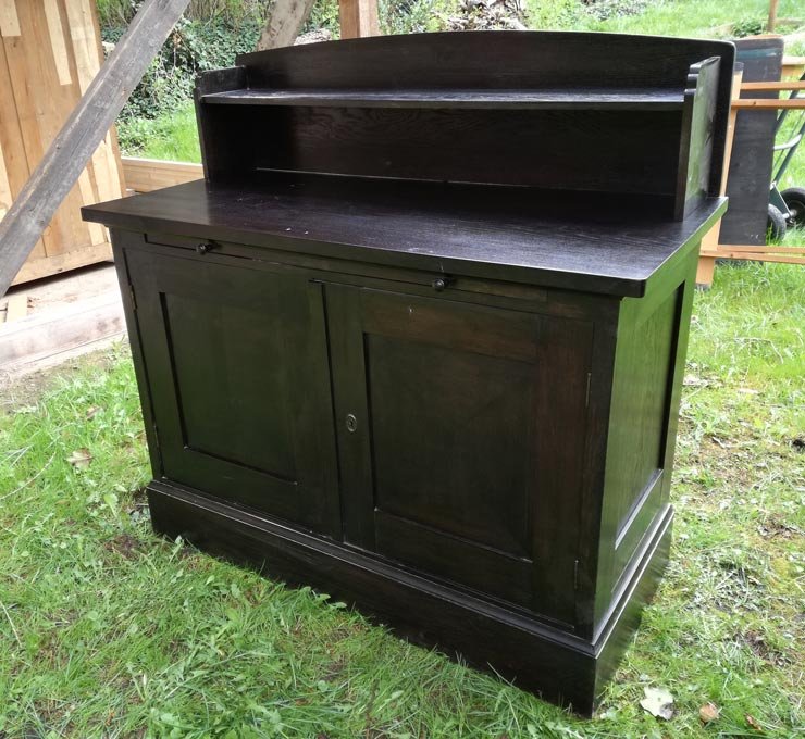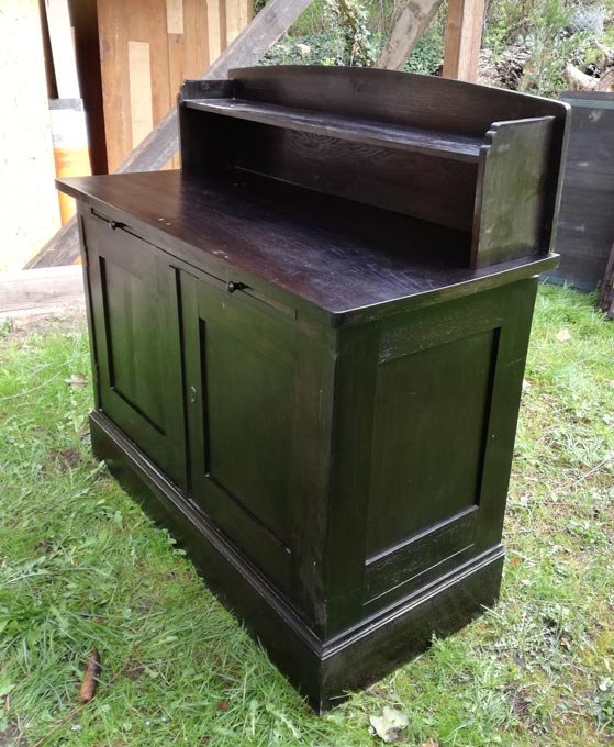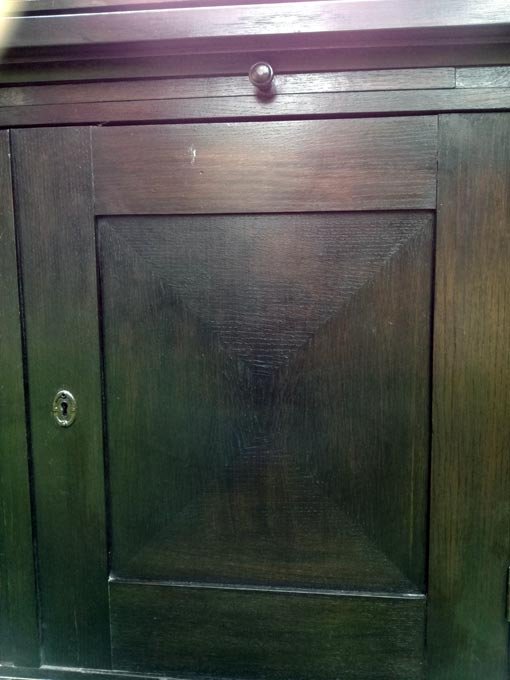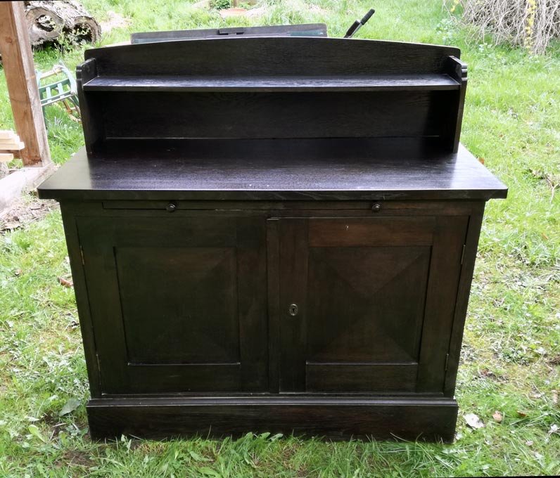 Anrichte ca 1910, Jugendstil in der strengen Art von R.Riemerschmid, Hellerau. Zweitürig darüber mit Auszugplatte. Der Aufsatz ist abnehmbar, es ist möglich es auch ohne Aufsatz zu stellen.
