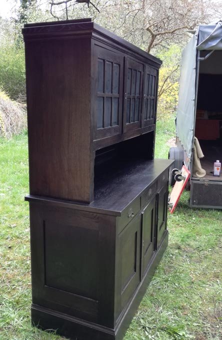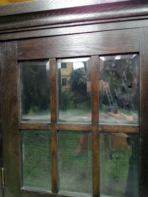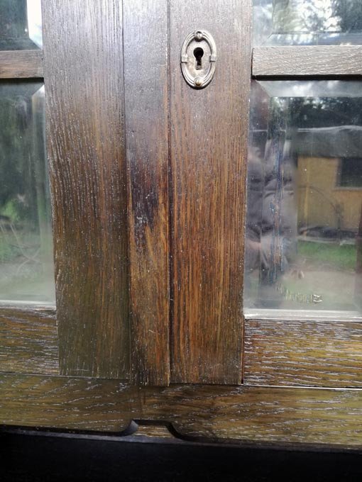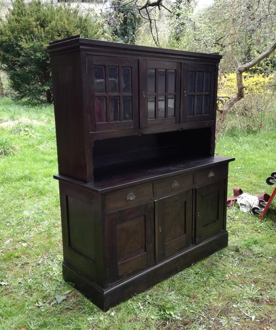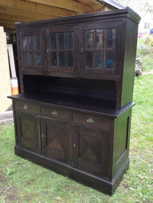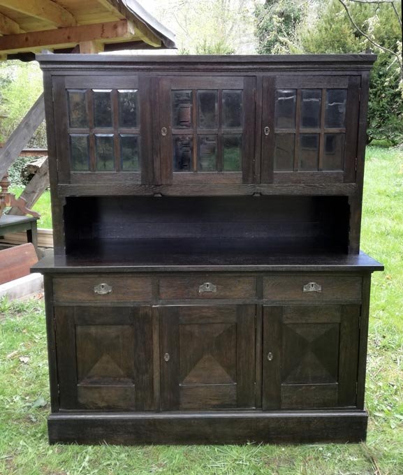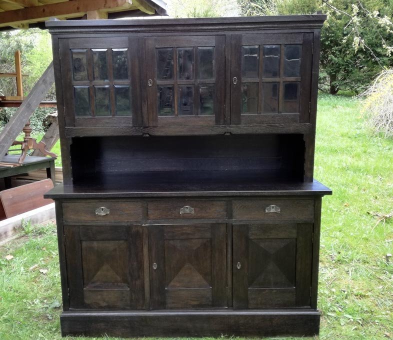 Buffet ca 1910, Jugendstil in der strengen Art von R.Riemerschmid, Hellerau. Unterteil dreitürig mit drei Schubkästen. Oberteil ebenfalls dreitürig, verglast mit je 6 facetierten Scheiben.