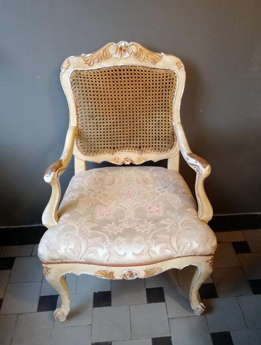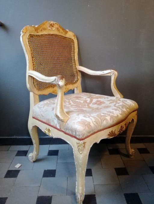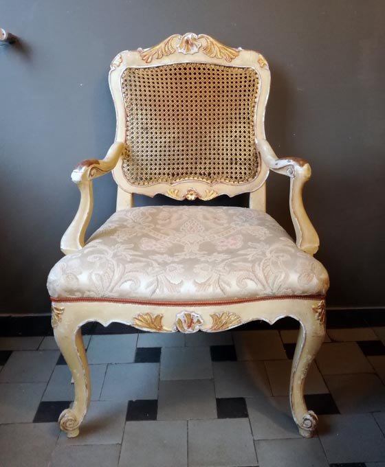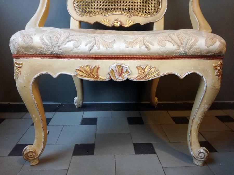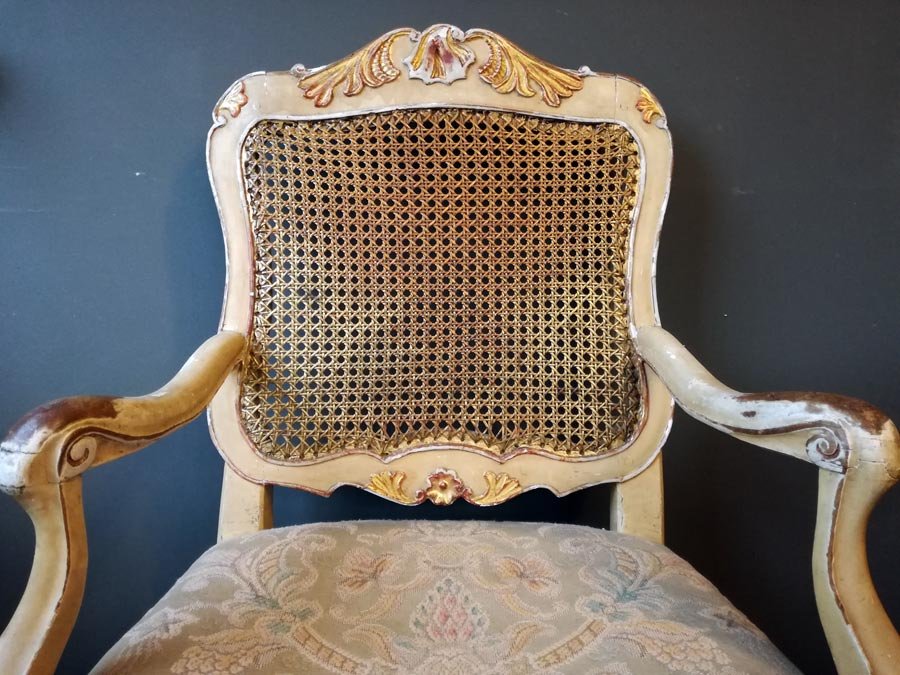Armlehnstuhl, Barock um 1740. Buche, original farbig gefaßt und vergoldet.