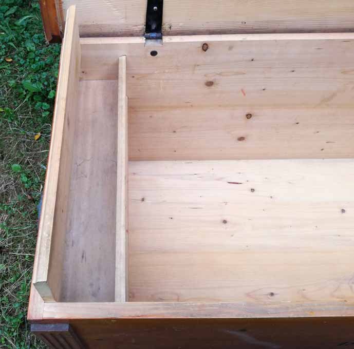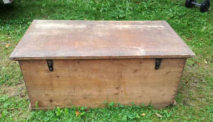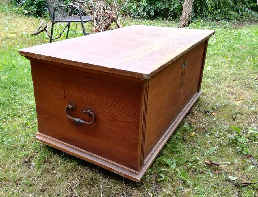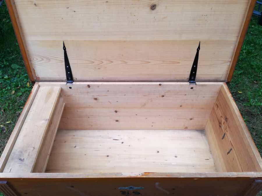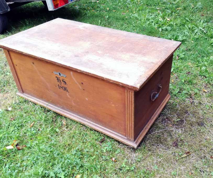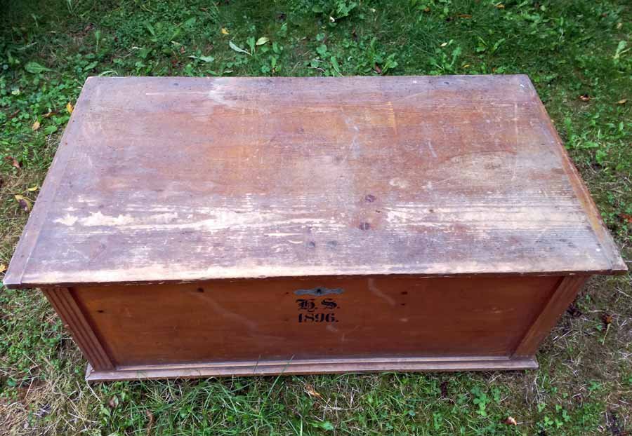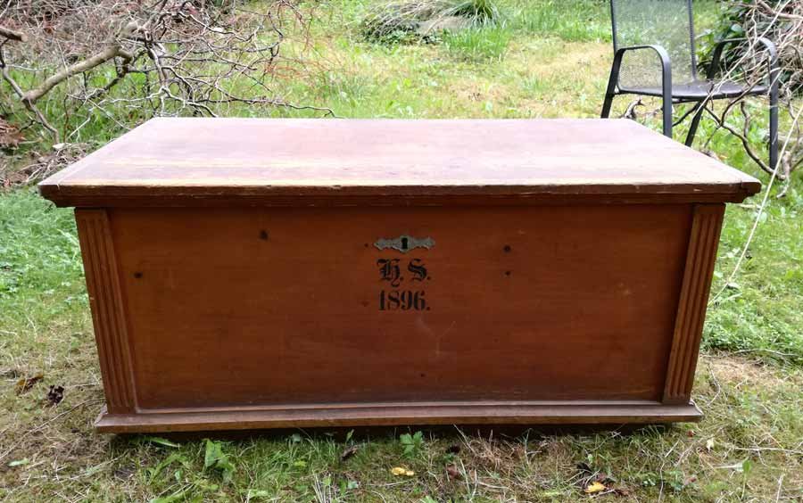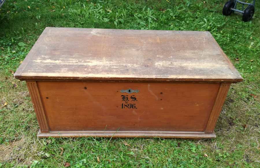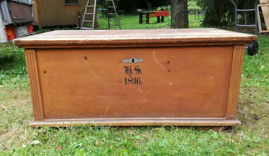 Große Truhe mit flachem Deckel. Schöner, gebrauchter Zustand, innen sauber. Datiert 1896 vermutlich älter. Auf Kufenfüßen, seitl mit Griffen. Schloß nicht vorhanden. B. 124, T. 66, H 57 cm.