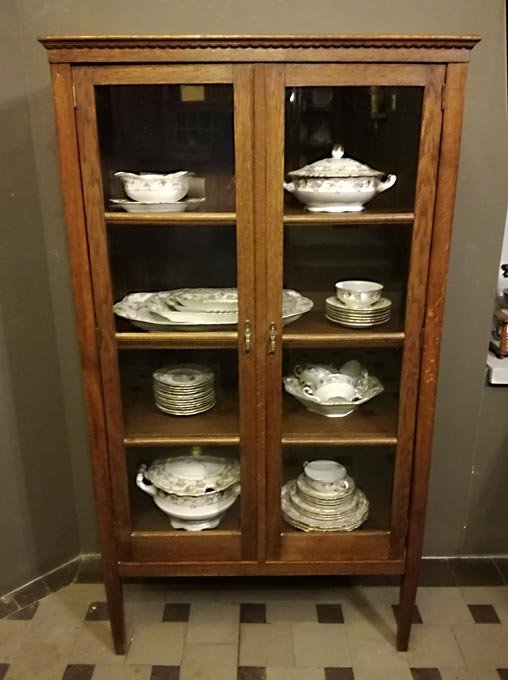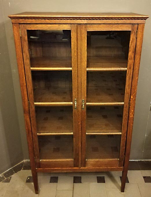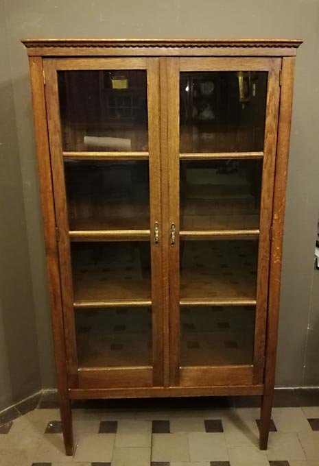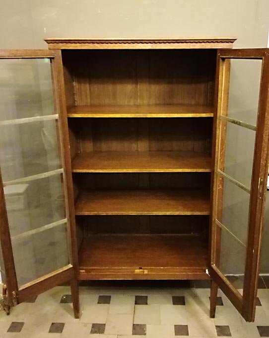 Reserviert! Kleine Vitrine um 1910. Zierliches Möbel, Eiche mittelhell. Drei höhenverstellbare Bretter.