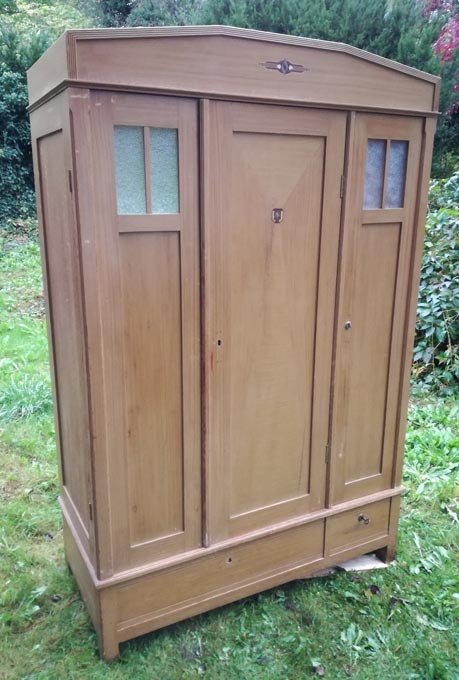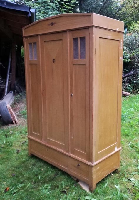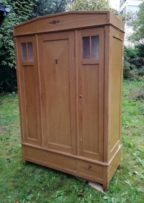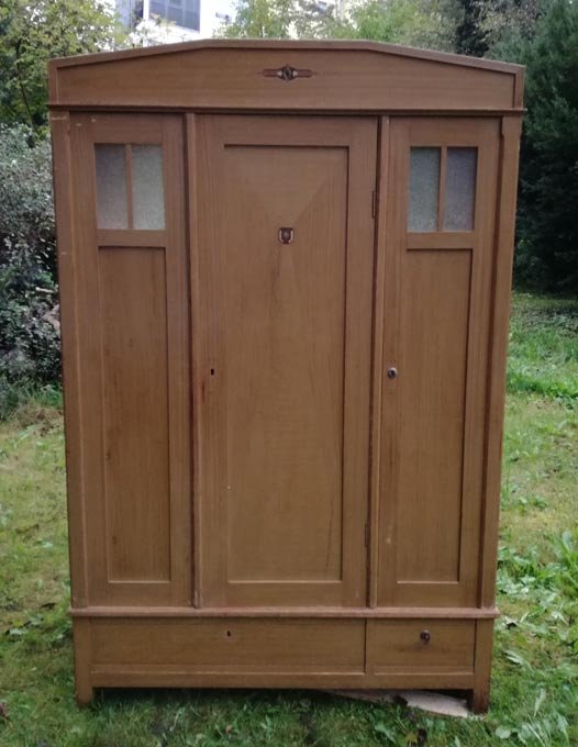 Unrestaurierter Kleiderschrank von ca 1910, Weichholz. Guter Zustand, mit Gebrauchsspuren und Fehlteilen, nutzbar. Rechts ca 35 cm mit Brettern, Mitte + Links ca 90 cm mit Kleiderstange. H. 200 cm, B. 130 cm, T. 58 cm.