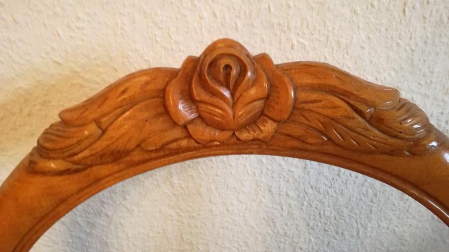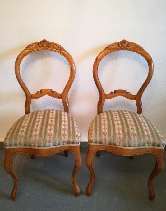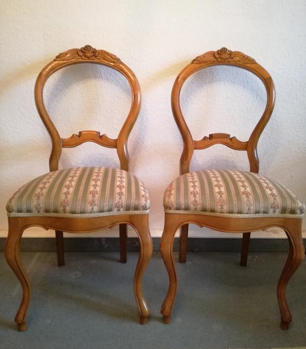Zwei Stühle, Spätbiedermeier um 1850. Die Rückenlehne mit Schnitzerei. Helles Hartholz, Obstholz.