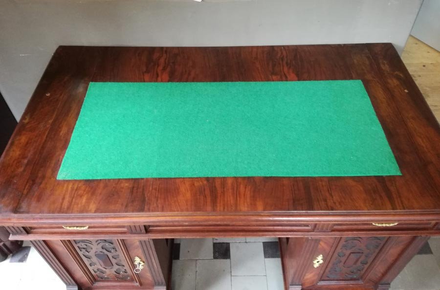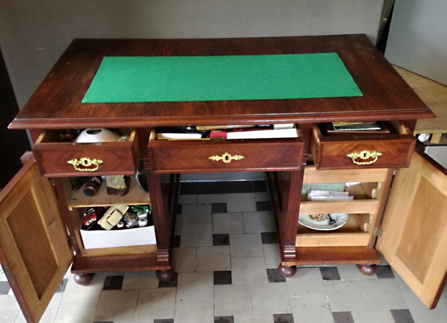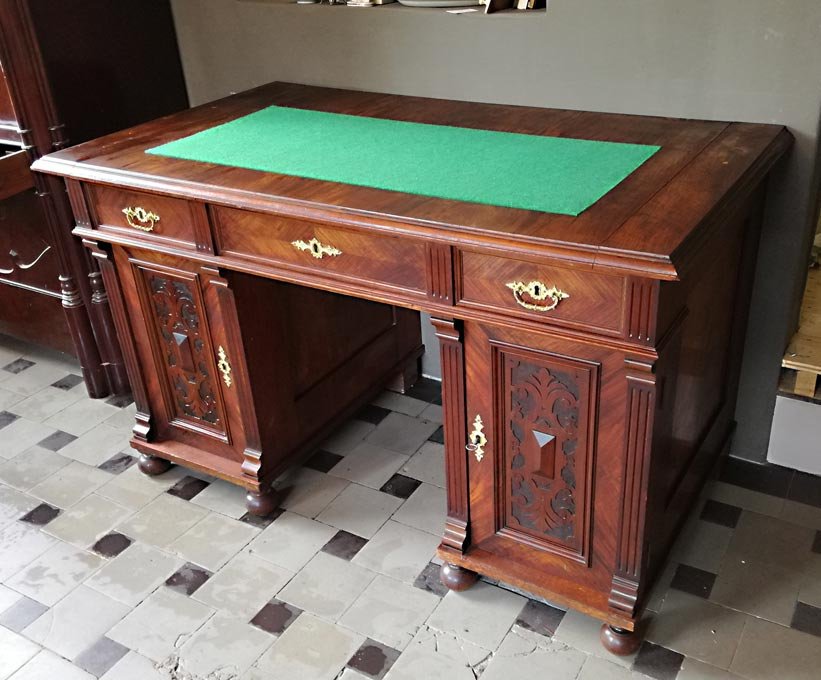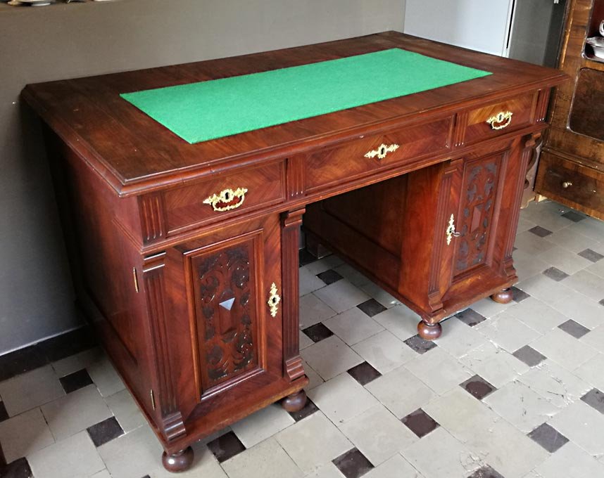 Schreibtisch, Nußbaum furniert um 1880. Oben drei Schubkästen. Beidseitig Türen, rechts mit drei Schubkästen, linke Tür mit einem Einlegebrett. Schreibfläche mit grüner Stoffbespannung.