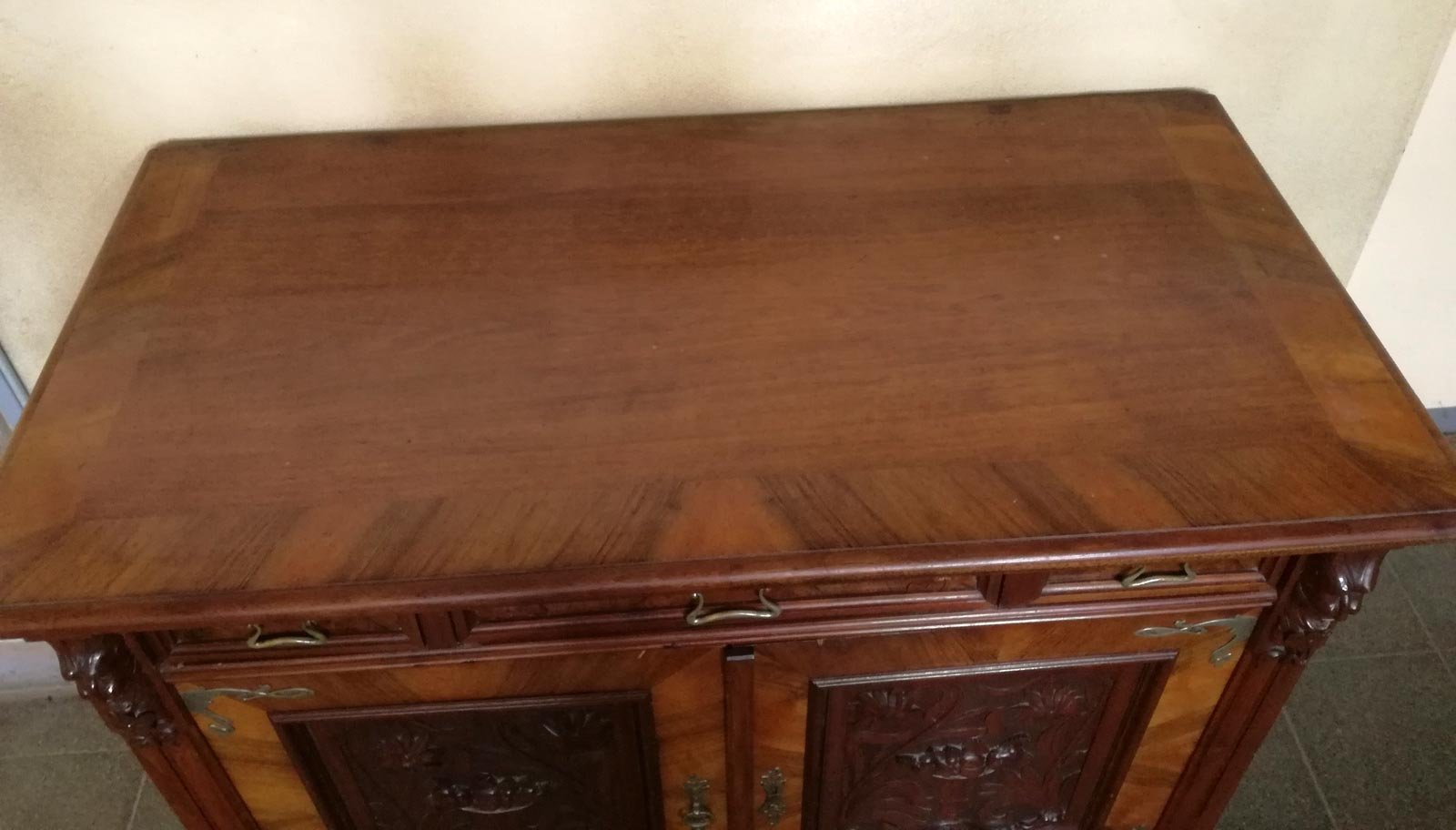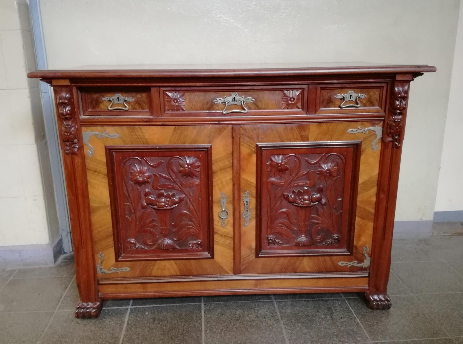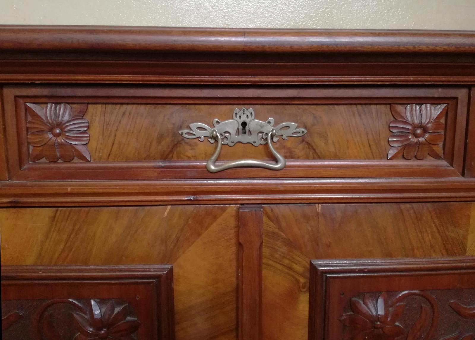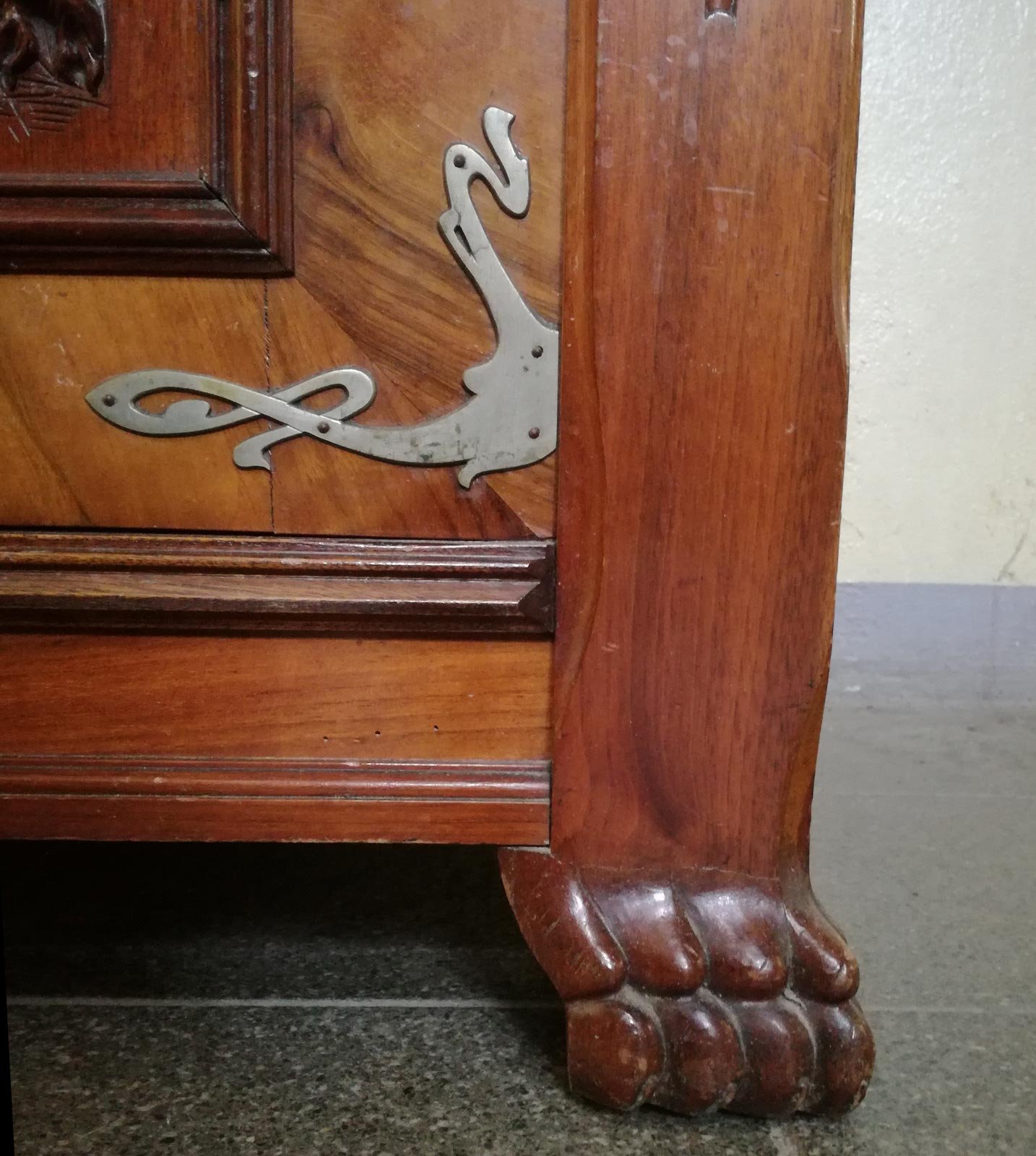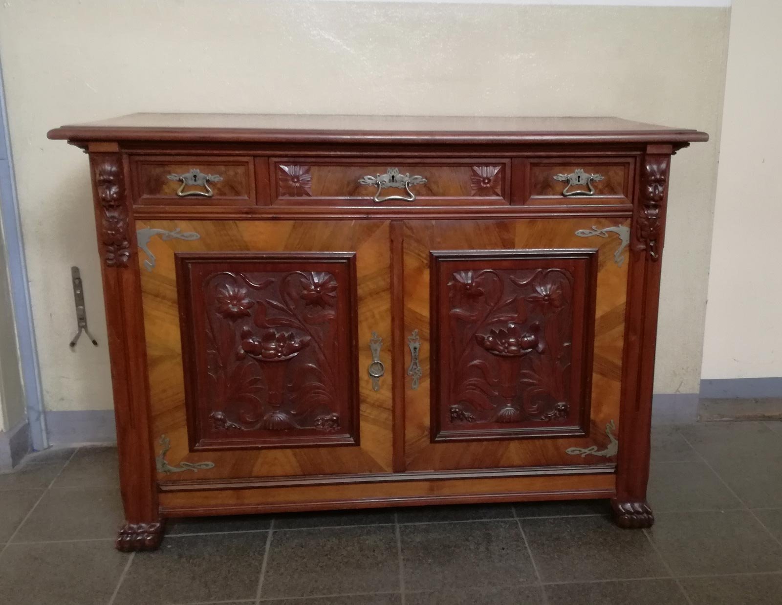 Aufwändige Jugendstil- Schnitzereien und Beschläge.