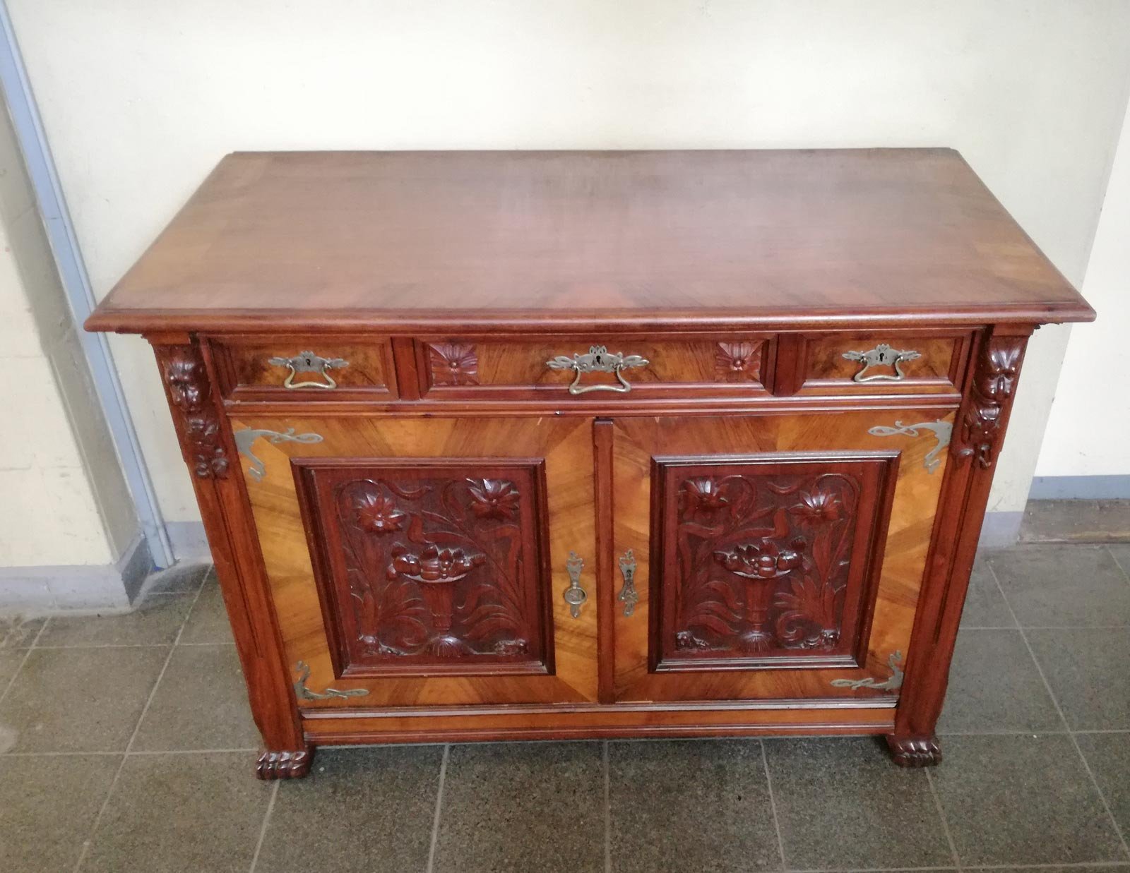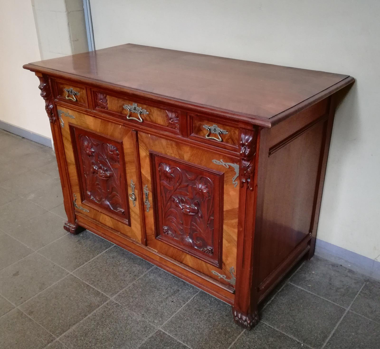 Jugendstil Anrichte zweitürig, darüber 3 Schubkästen. Nussbaum furniert und massiv.
