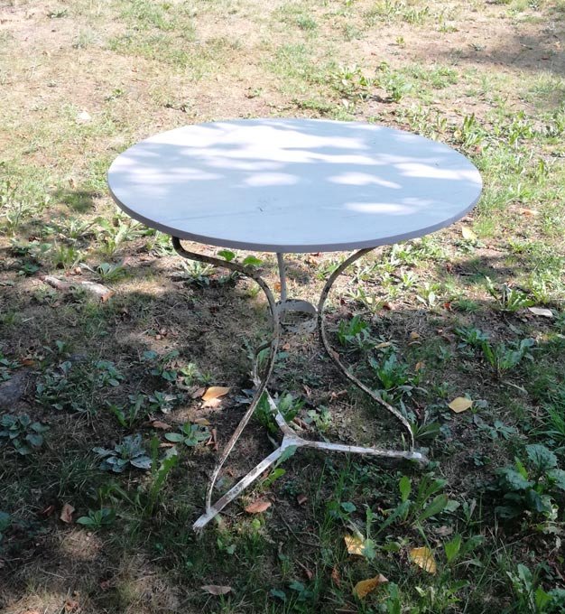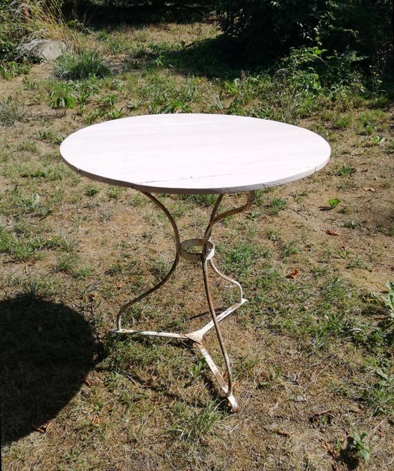 Alter Gartentischum 1920, Shabby Chic. Eisengestell mit Holzplatte. Das Gestell mit farblosem Rostschutz behandelt. Platte farbig Alt-Weiß, wetterfest. H. 78, D. 76 cm.