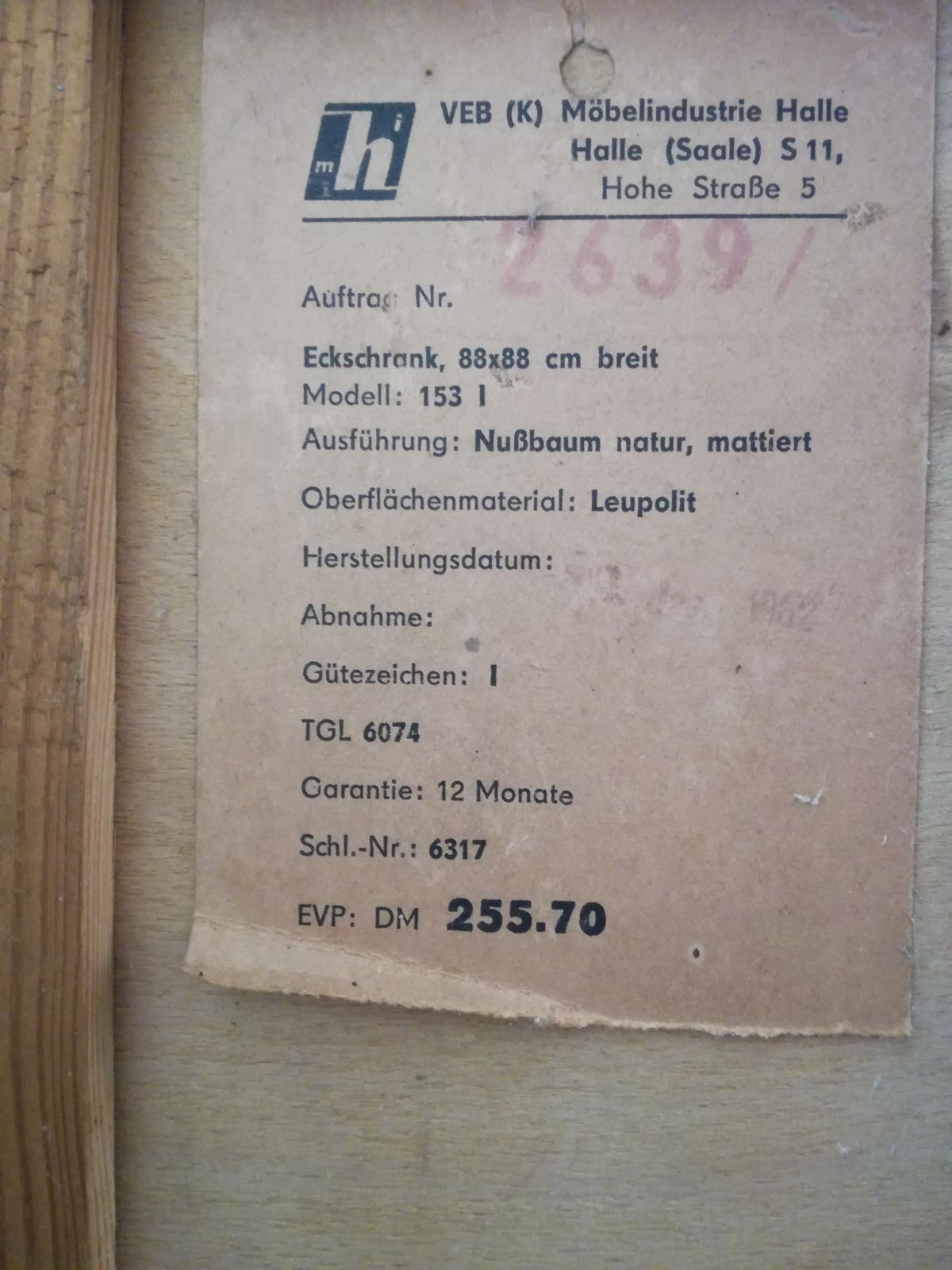 Eckschrank, VEB Möbelindustrie Halle, Entwurfsbüro Schkeuditz, Herstellungsjahr 1962; Midcentury Klassiker.