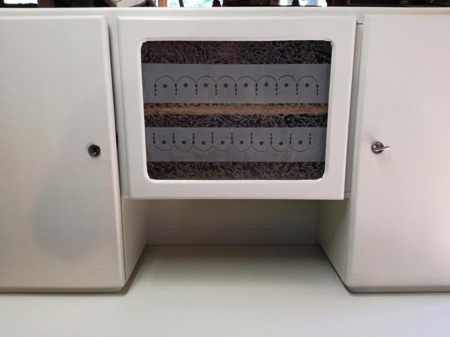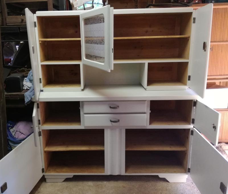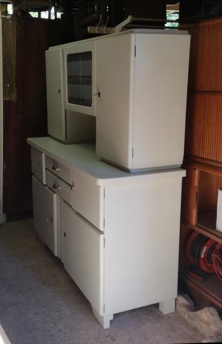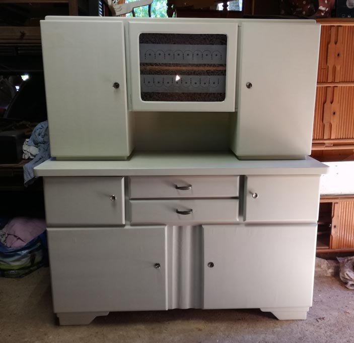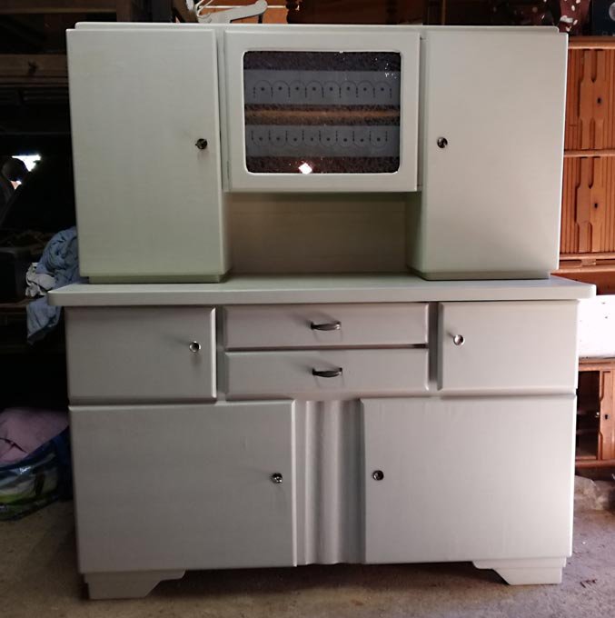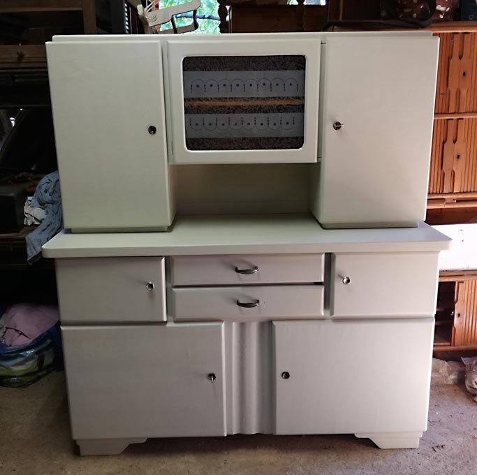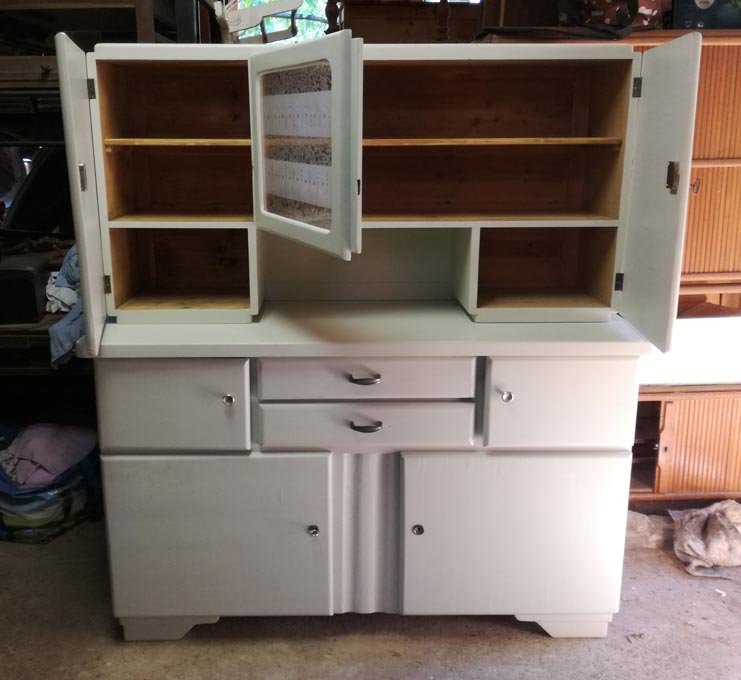 Kuchenbuffet aus den 30ger Jahren. Sofort nutzbar. Es wurde alles innen und aussen gesäubert, geschliffen, repariert und die Farbfassung (grau-weiss) erneuert. Es ist "hygienisch einwandfrei" , praktisch, alt und schön. H. 170 cm, B. 152 cm, T. 54 cm.
