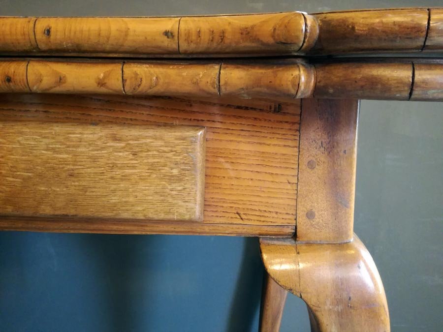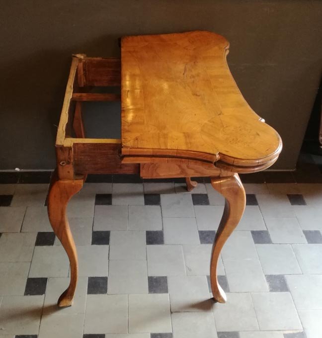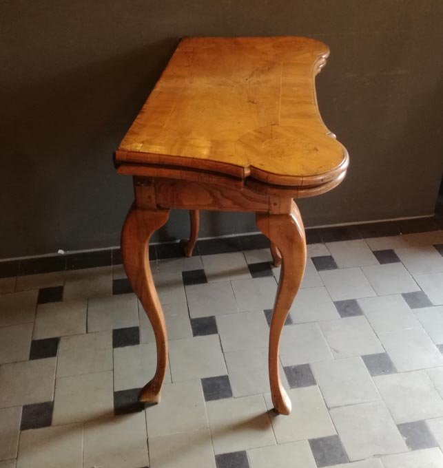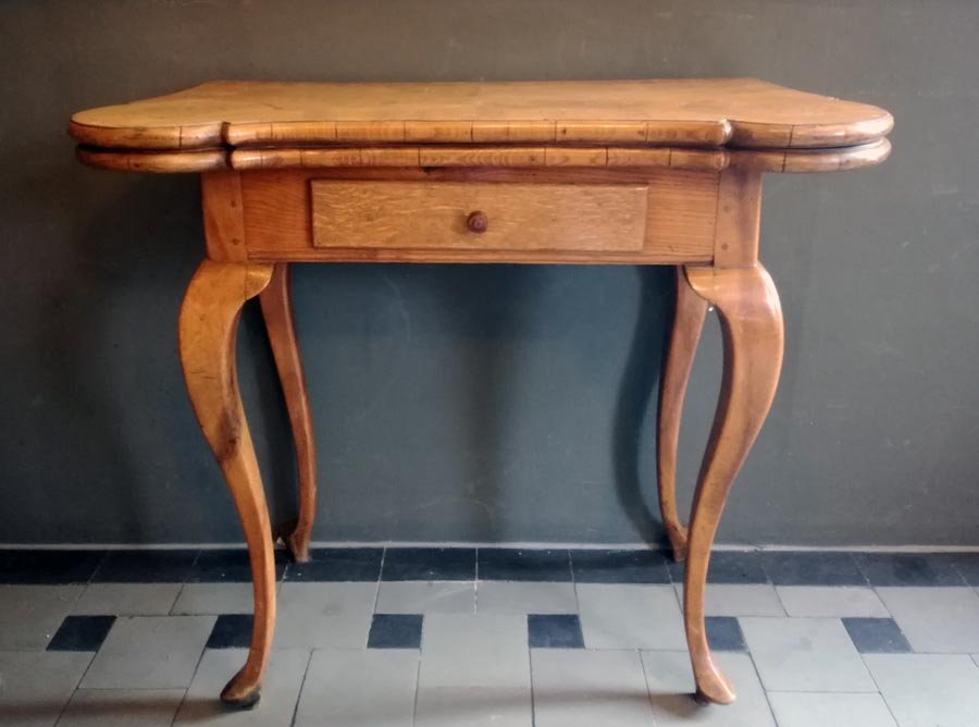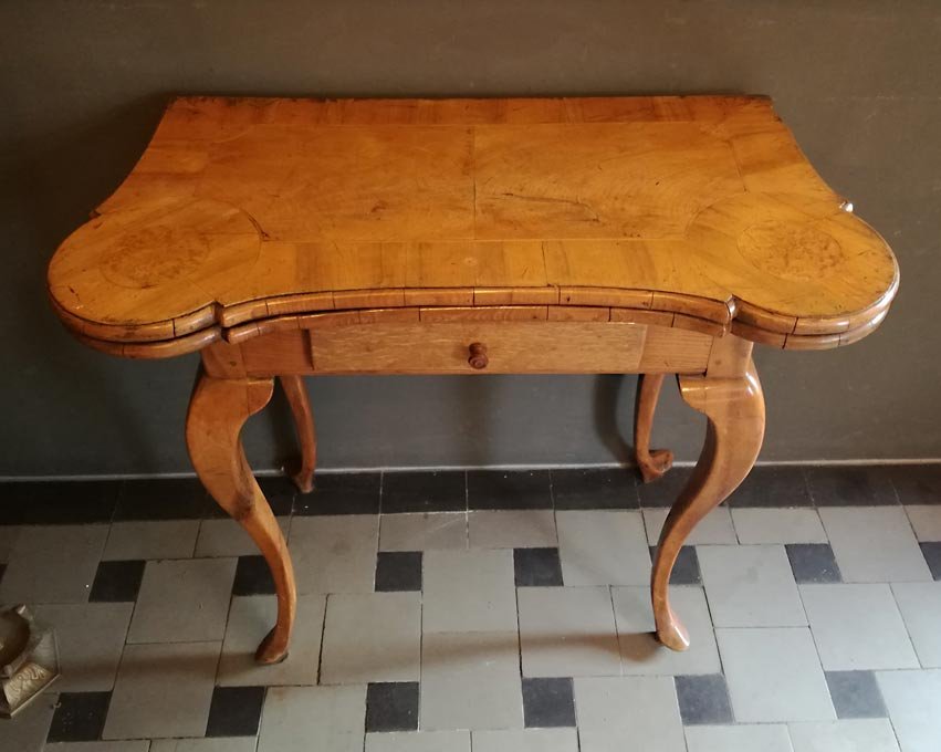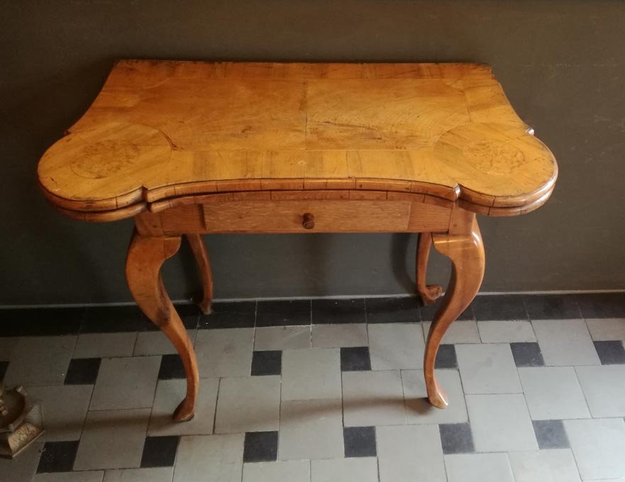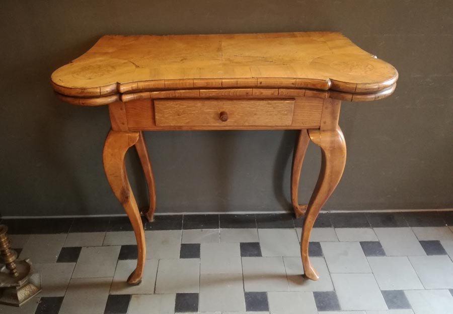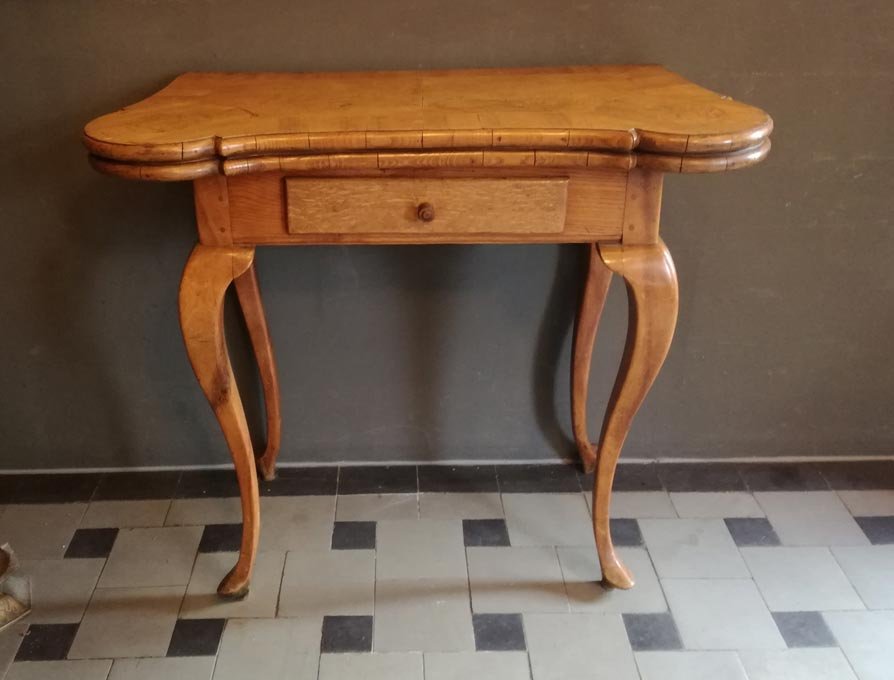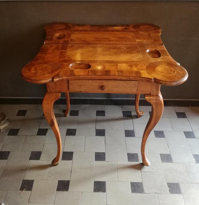 Reserviert! Spieltisch um 1750. Barocktisch mit Aufklappmechanissmus, aufgeklappt mit Spielfläche. Verschieden Hölzer, Esche und Nussbaum. Die Flächen der Tischplatte innen und aussen verschieden furnierte Einlegearbeiten und Bandintarsien. H. 75 cm, B. 83 cm, T. 41,5 cm; Platte aufgeklappt 83 x 83 cm. Guter Zustand, einige Fehlteile.