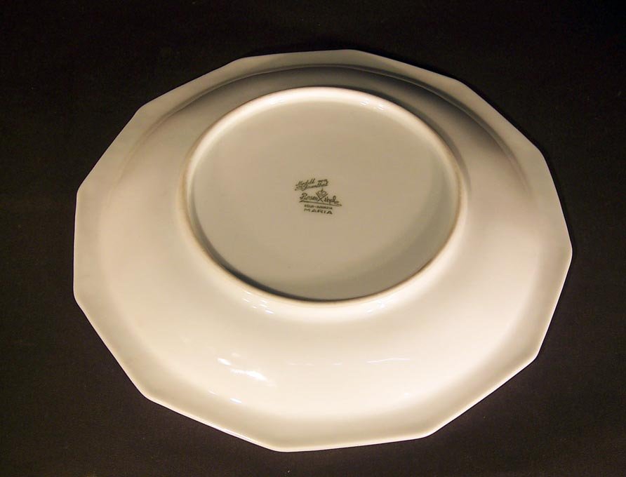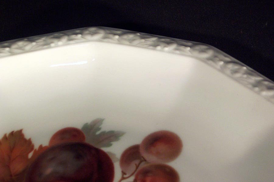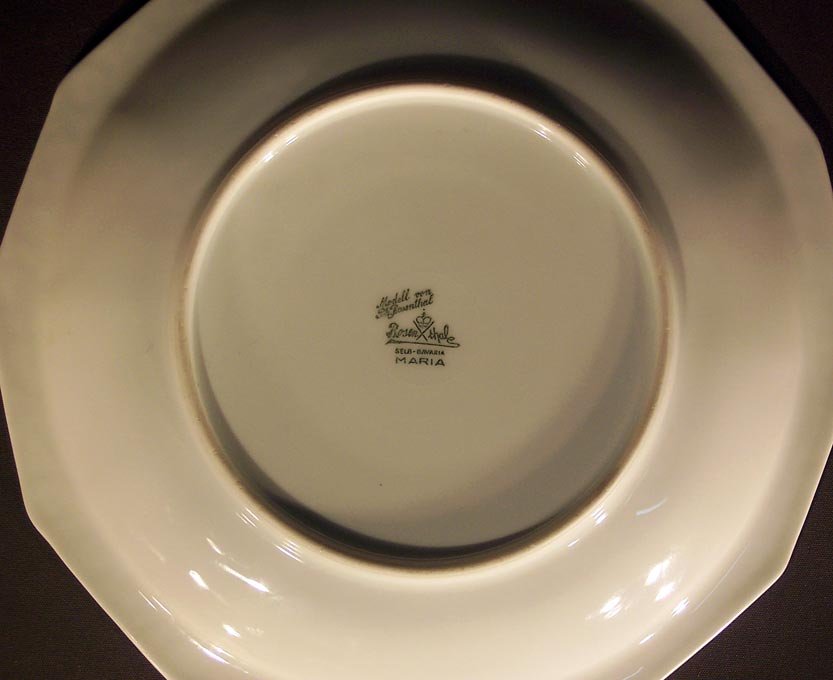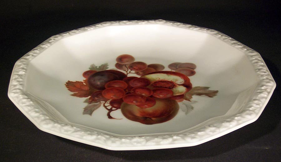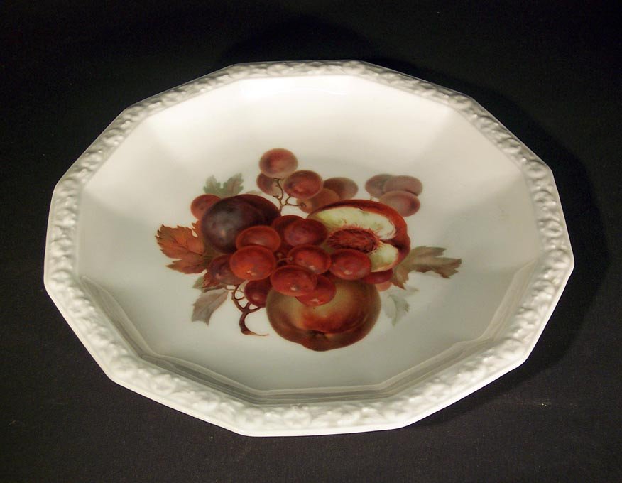 Teller von Rosenthal, Maria; Obstmalerei und Reliefrand.