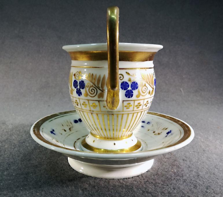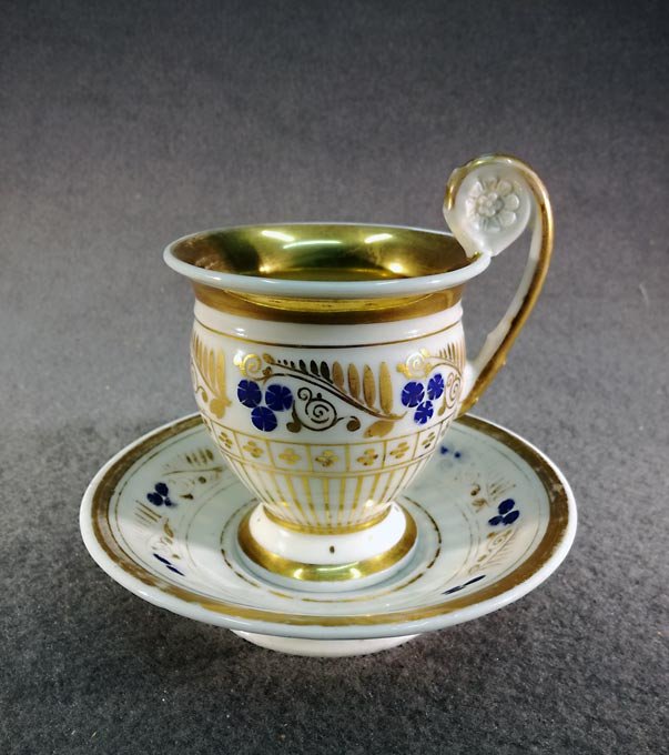 Biedermeiertasse mit Untertasse um 1820 - 1850. Prunkgedeck, Gold und blaue Blüten.