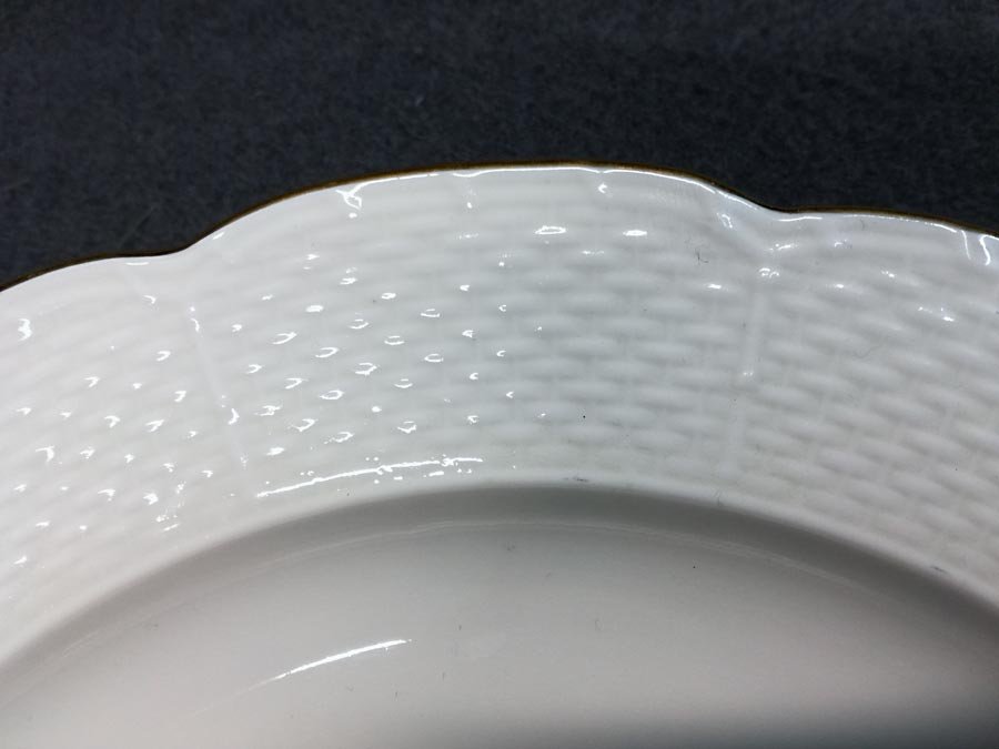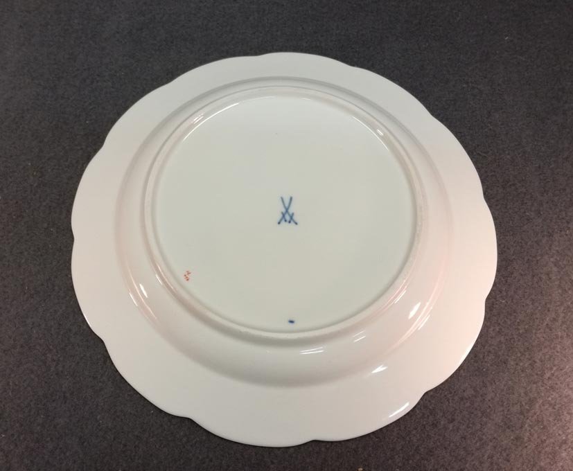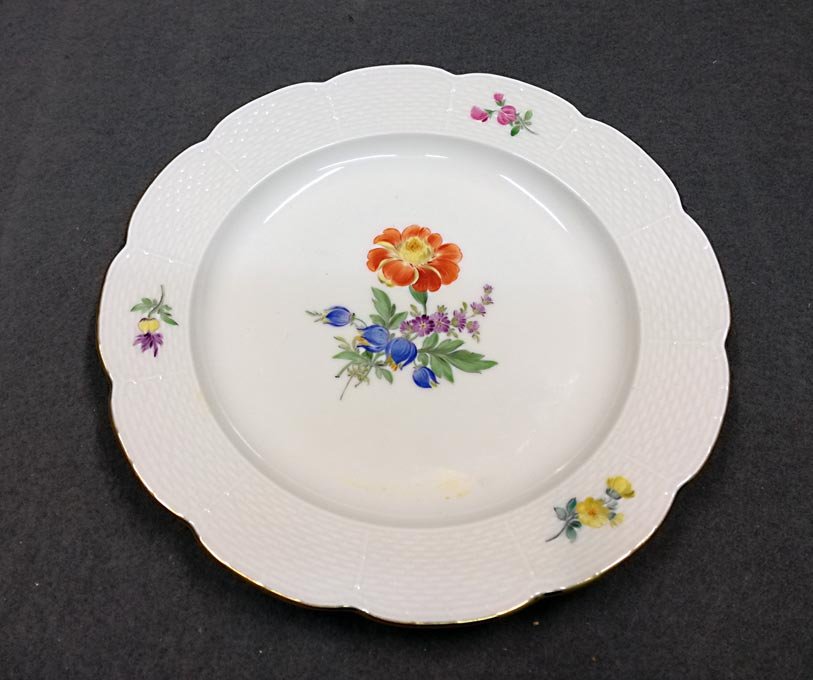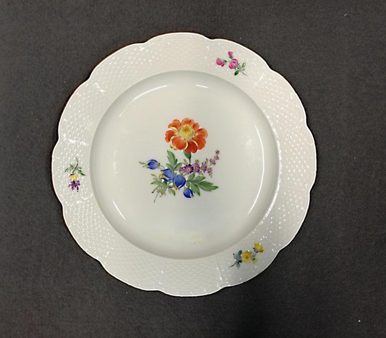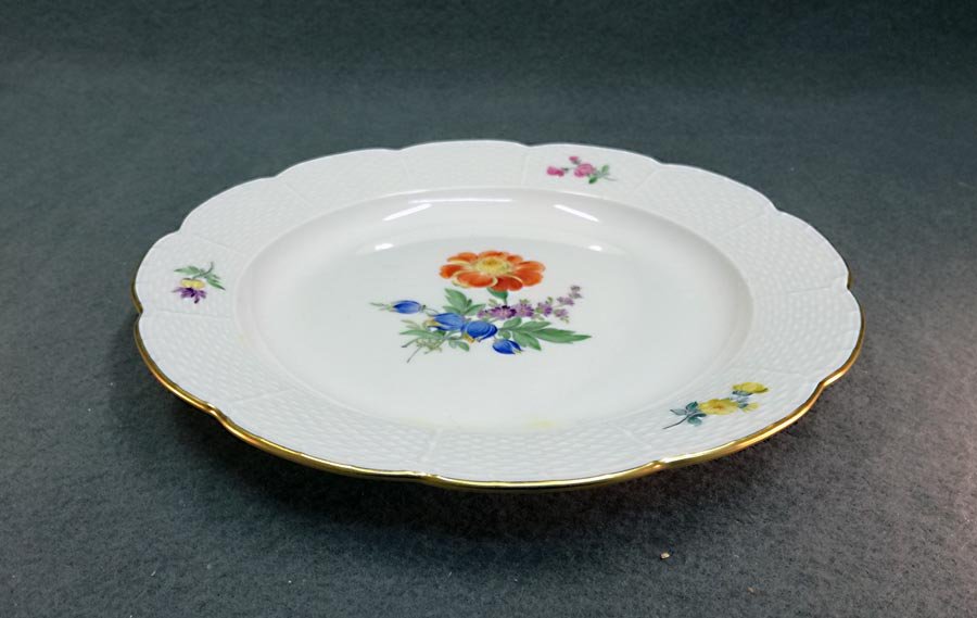 Teller, Manufaktur Meissen, Ozier Reliefrand (Weidenkorb-Rand). Blumenmalerei und kleinere Blümchen am Rand. Ränder mit Goldzier.