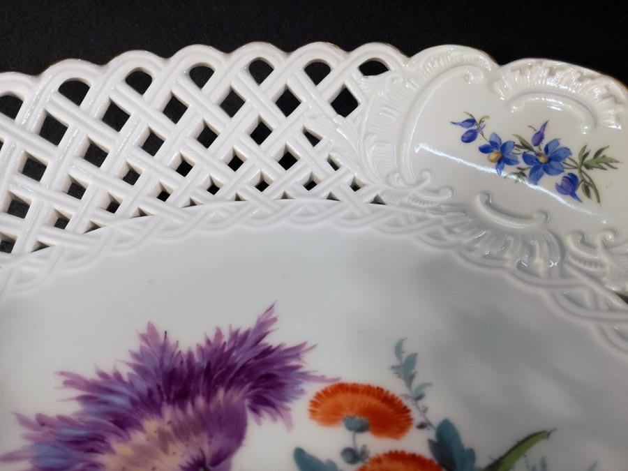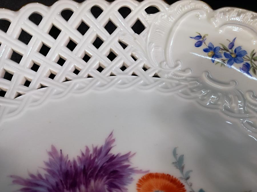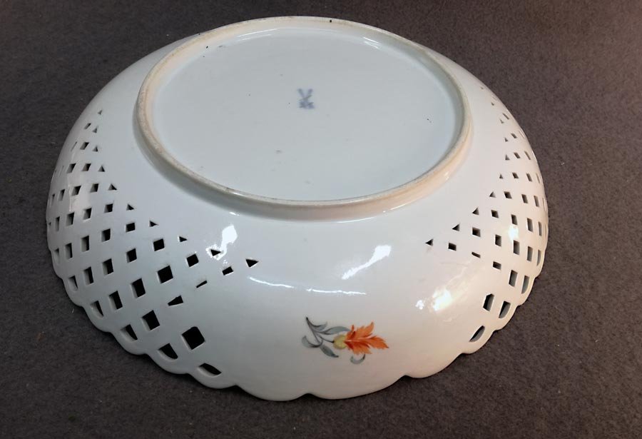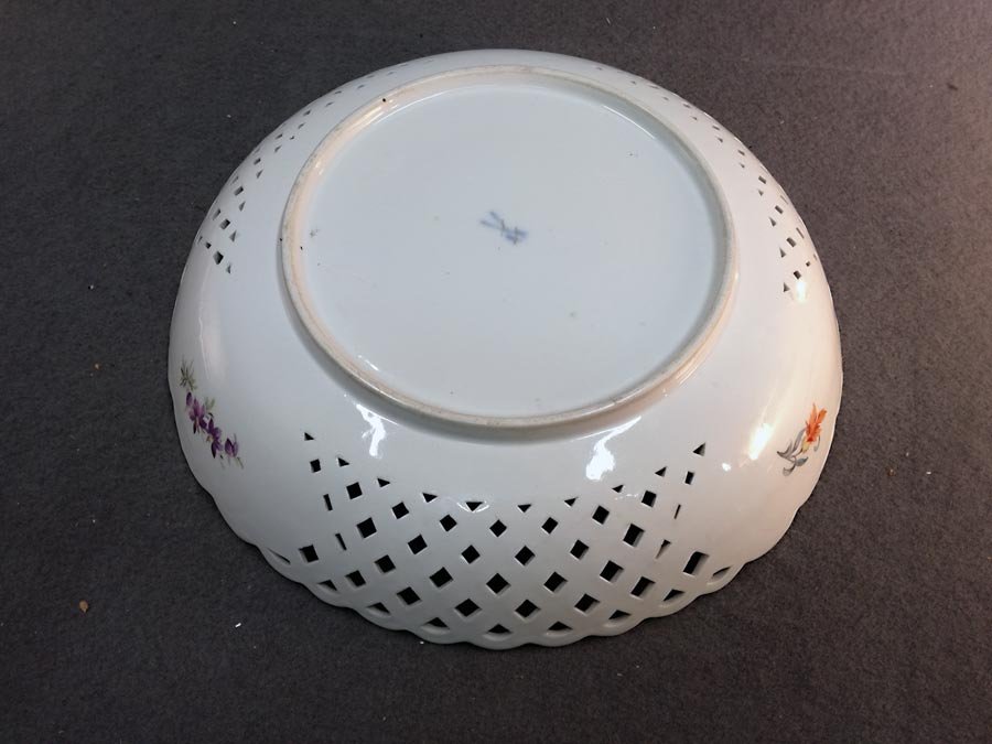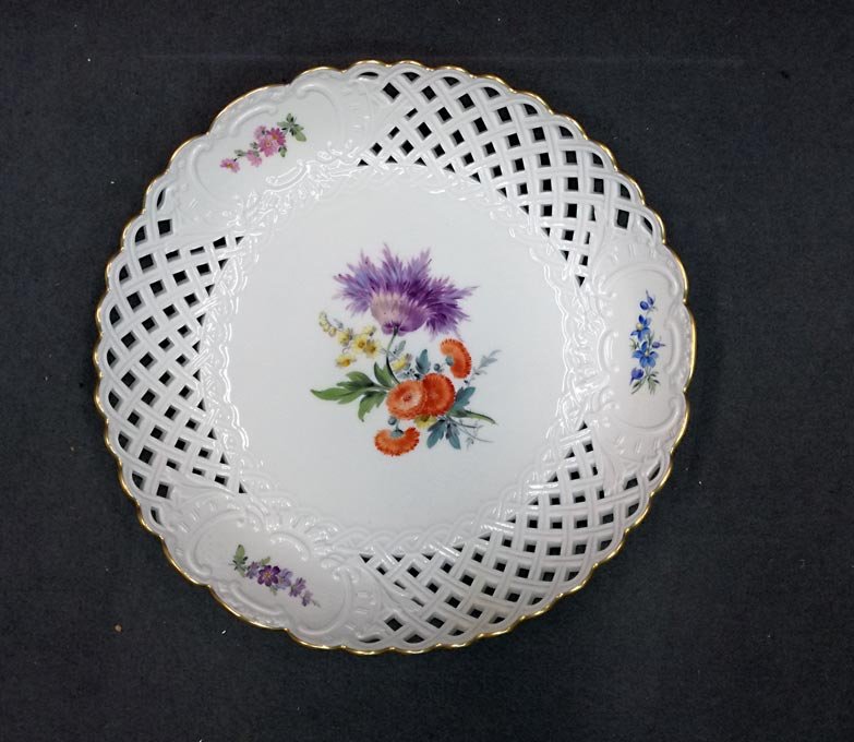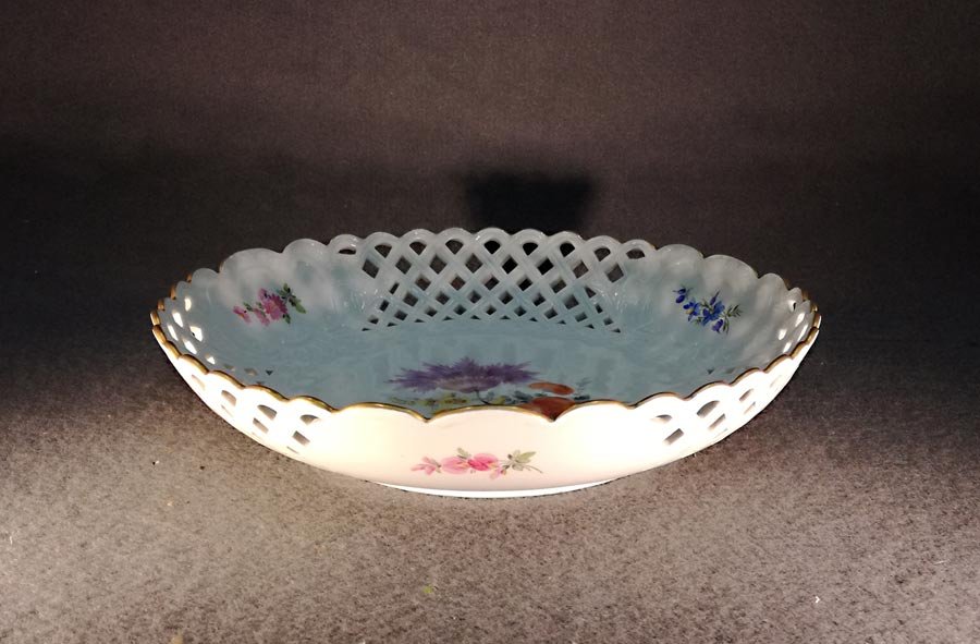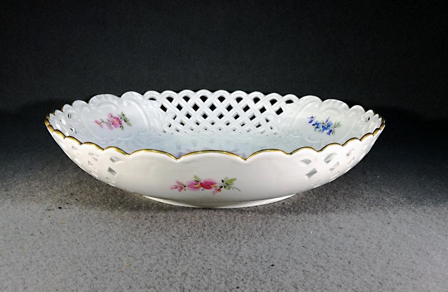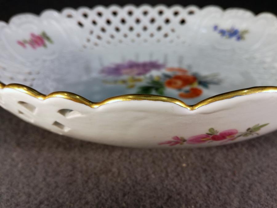 Meissen; großer Korb, Flechtrandschale mit Reliefdekor, Blumenmalerei und Gold. In der Mitte Blumenbukett, in den drei Reserven der Fahne je Blumen. Blumenmalerei auch aussen. Oberer Rand mit Goldzier.