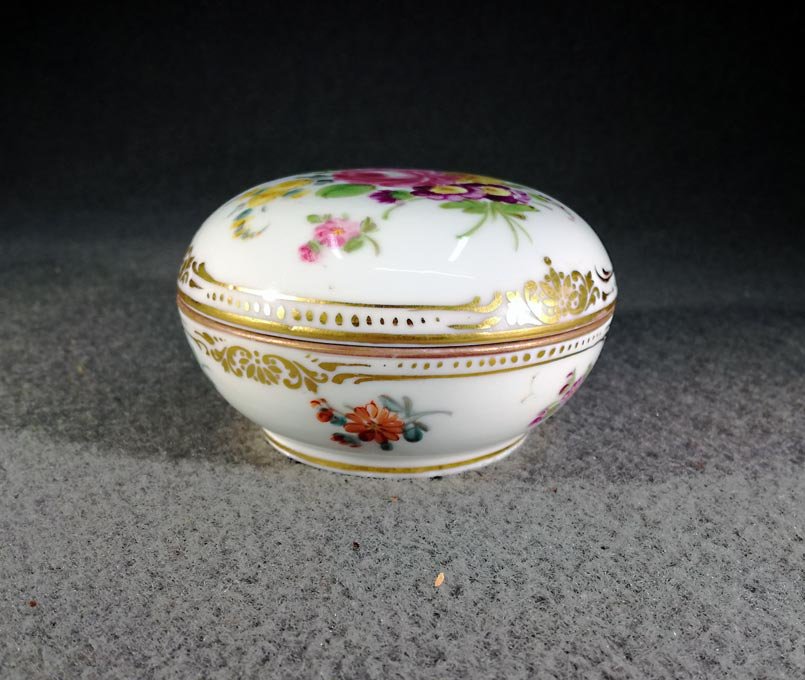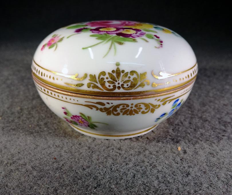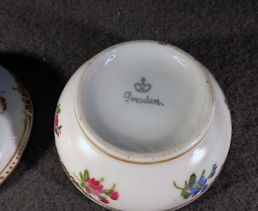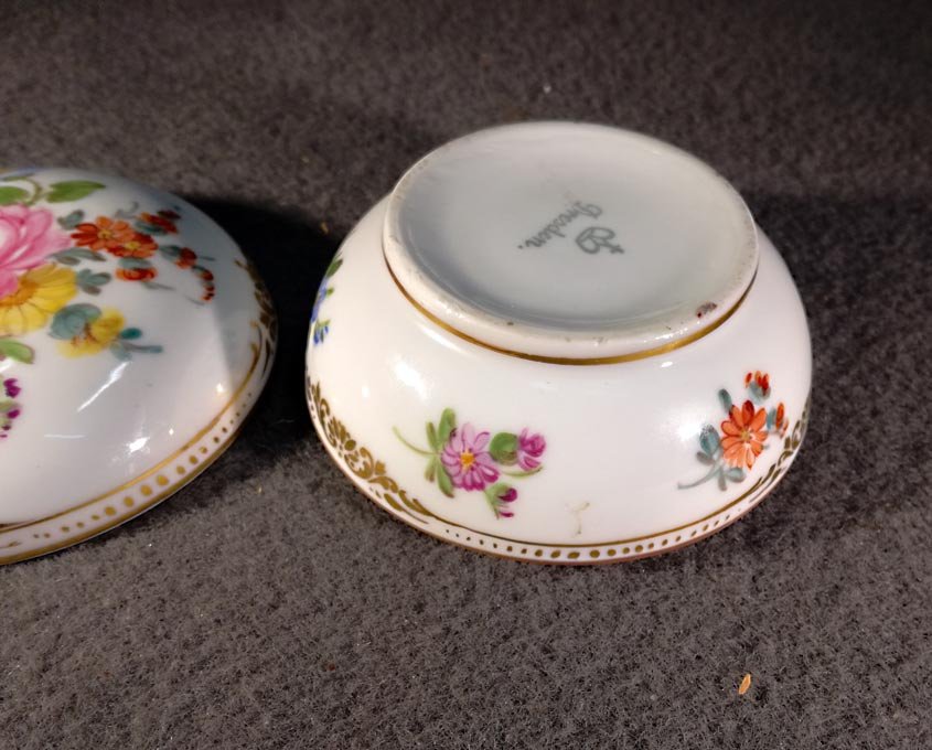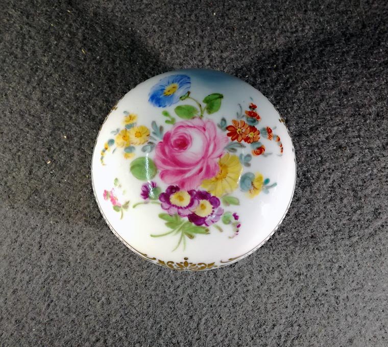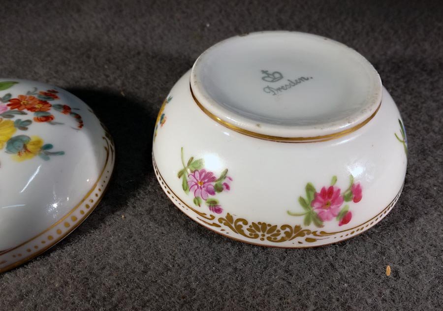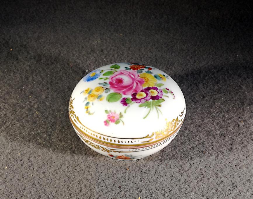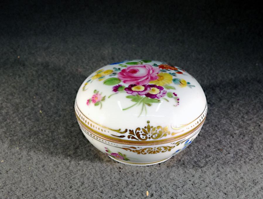 Res! Dresden Porzellan, Dose, Schmuckdöschen Blumenbukett und Gold