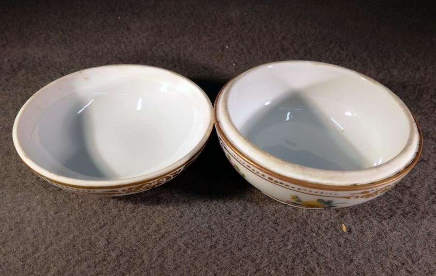 Deckel mit reicher Blumenmalerei, reiches Blumenbukett und Goldzier. Unterteil mit Streublumen und Gold. Am Standring ebenfalls Goldrand.