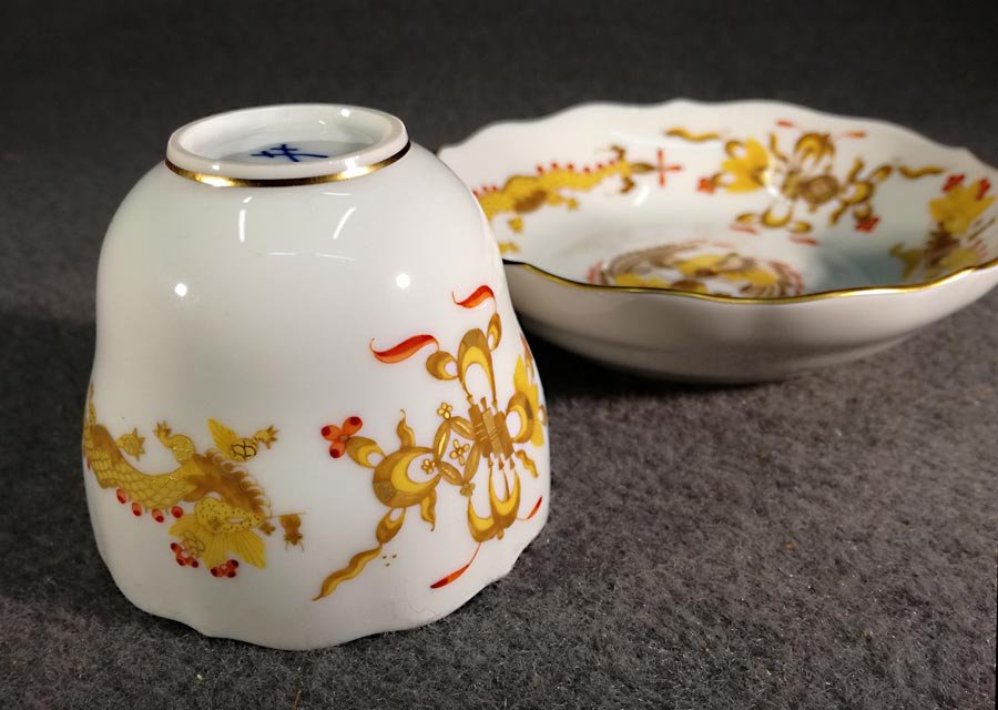 Manufaktur Meissen, Mokkatasse, Gelber Drache Gold geschuppt und weitere Goldzier.