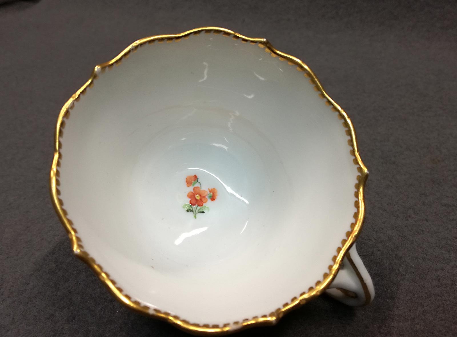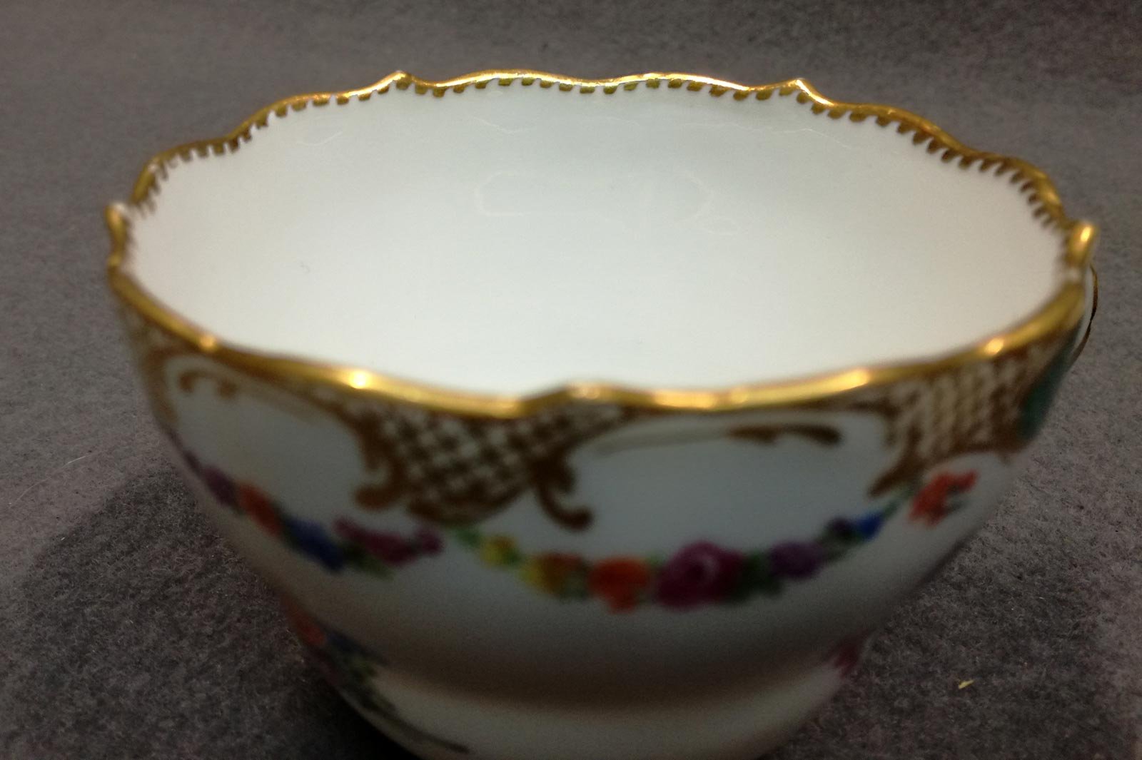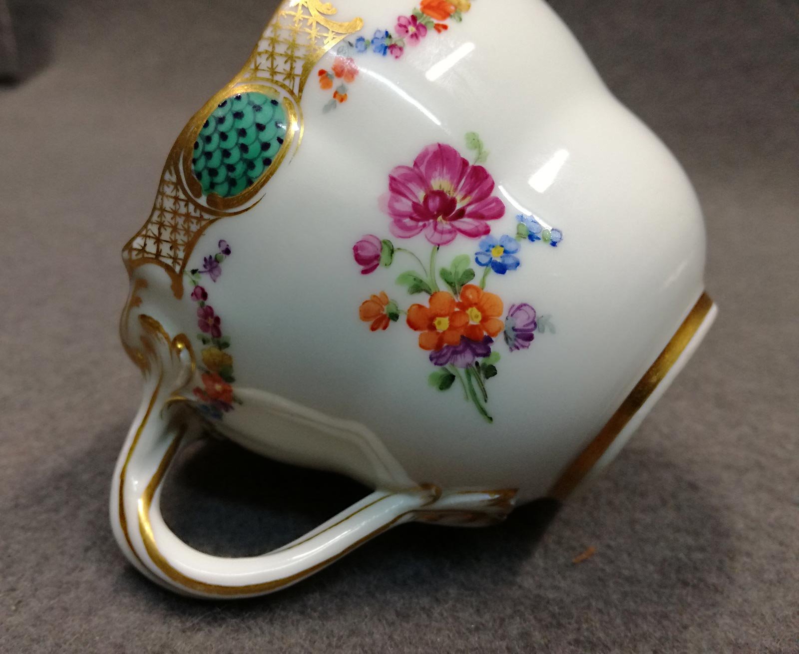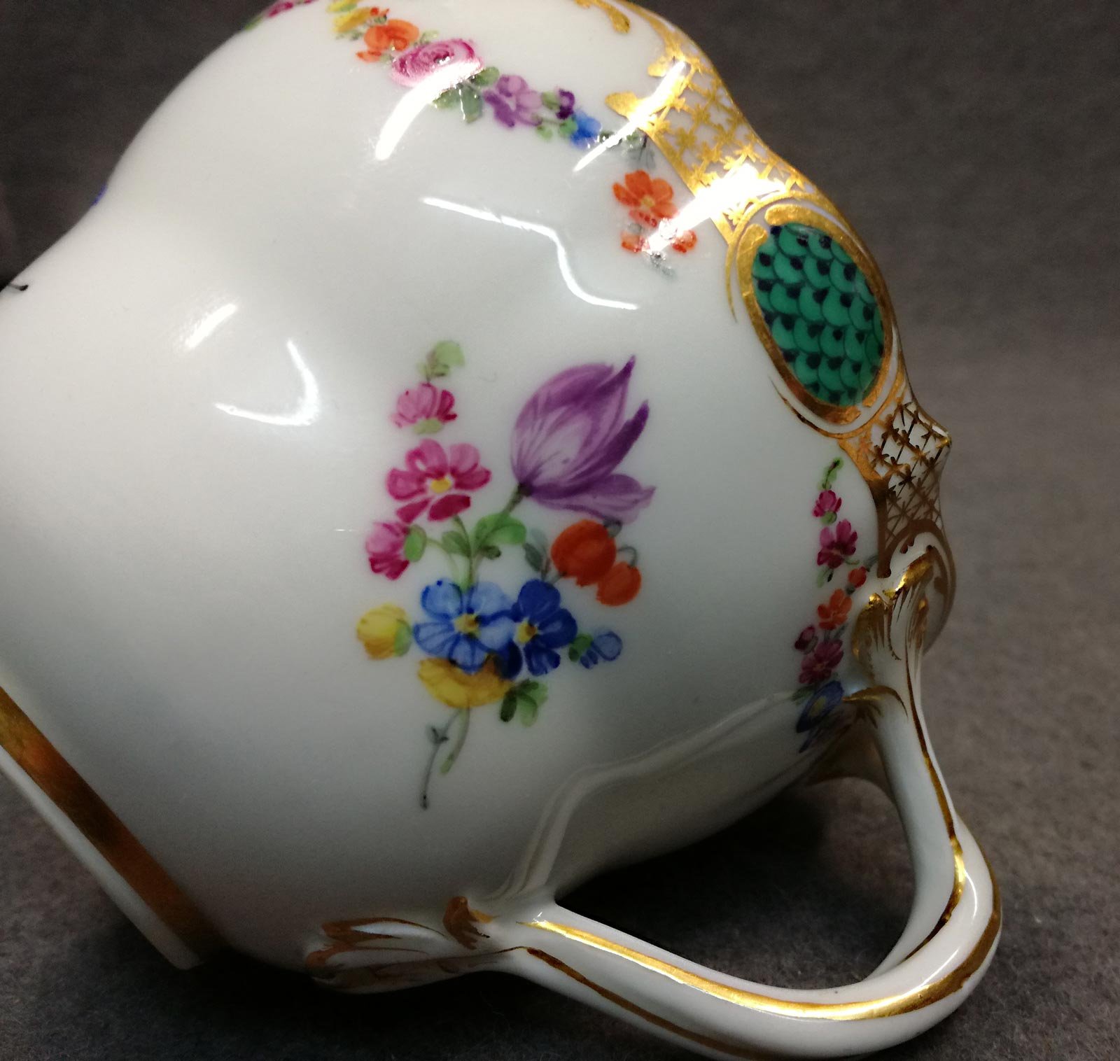 Blumenmalerei, reiche Buketts, und Gierlanden. Am Rand mit Rokaillen- und Netz- Goldbordüren sowie Kupfergrünen, geschuppten Medaillons. Astartiger Henkel ebenfalls goldverziert.