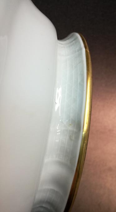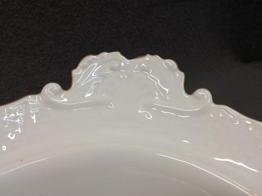 Terrine mit Neubrandenstein Reliefdekor auf Deckel, Terrinenrand und Fußring, zusätzlich Goldränder.