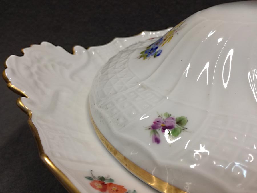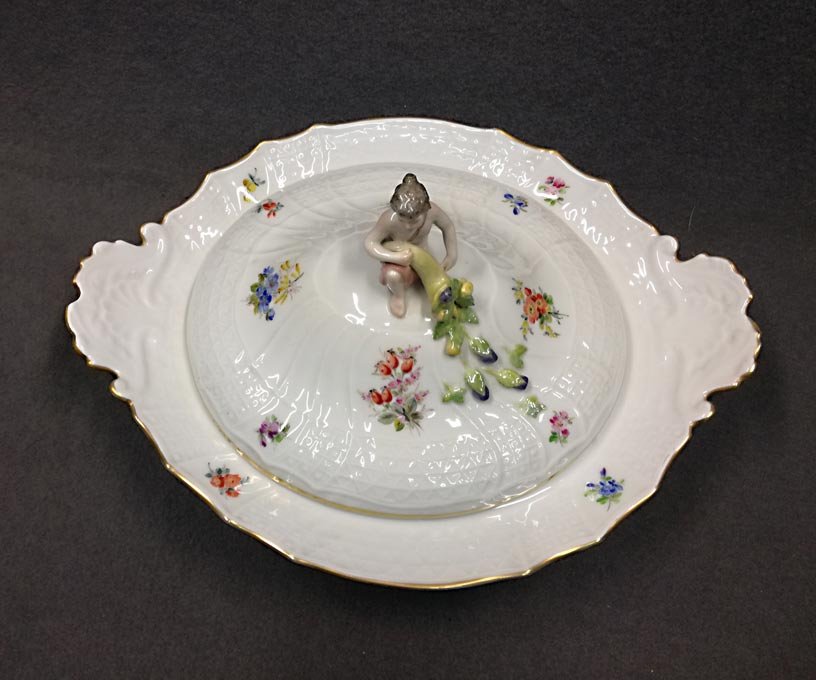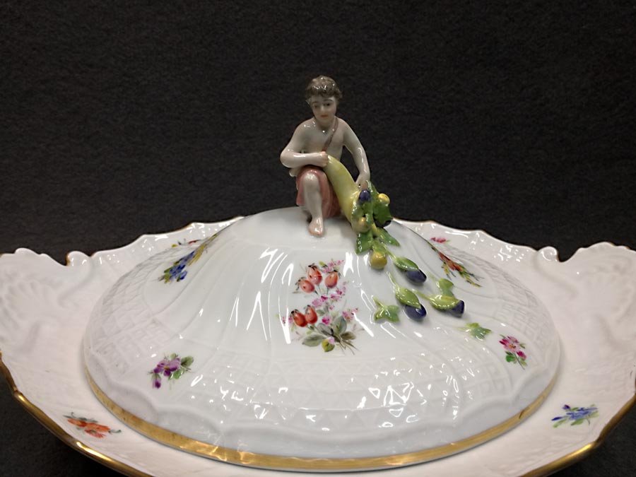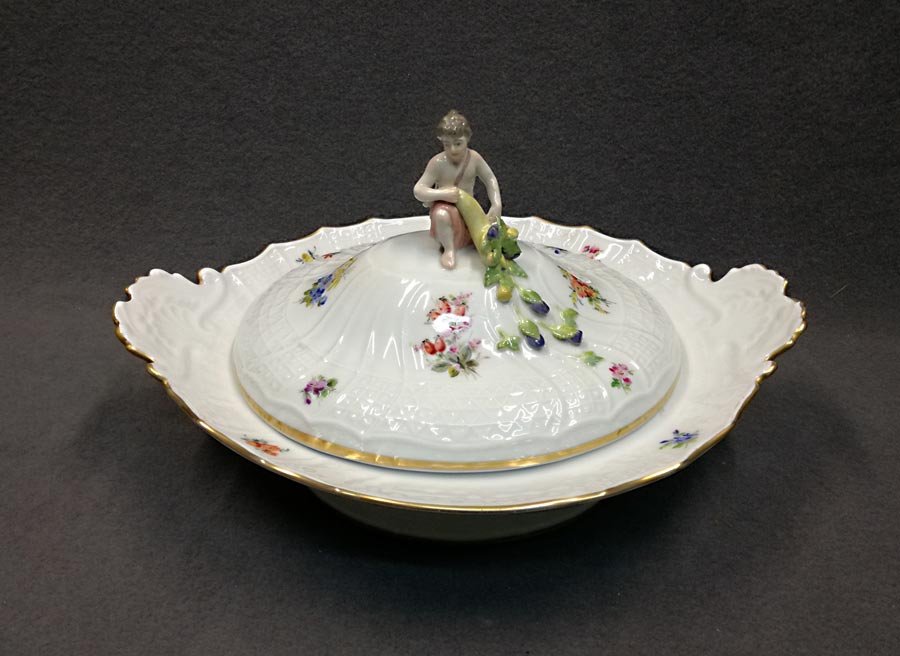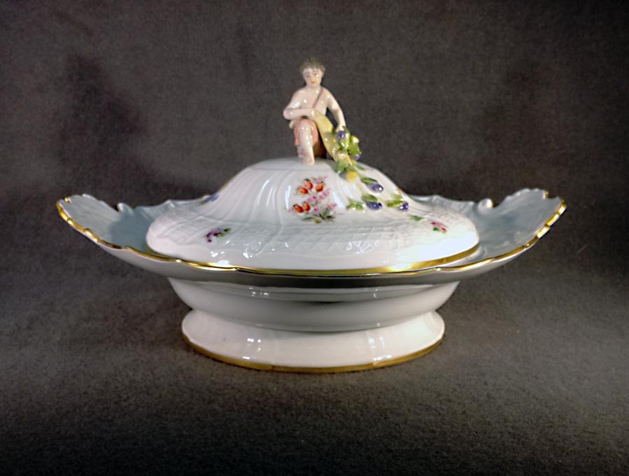 Terrine mit Figur als Deckelknauf. Ungemarkt, indentisch wie Meissen, sehr gute Qualität.
