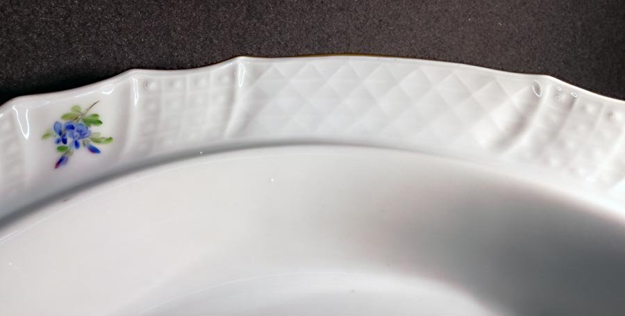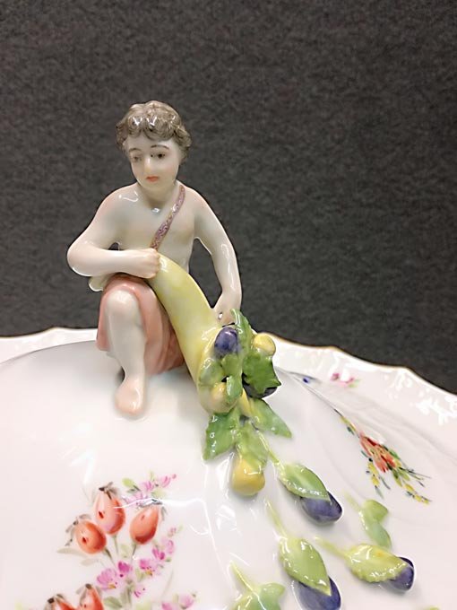 Die Qualität der Terrine und besonders der Figur in Ausformung und Malerei ist sehr gut. Ungemarkt, vermutlich Teichert in Meißen.