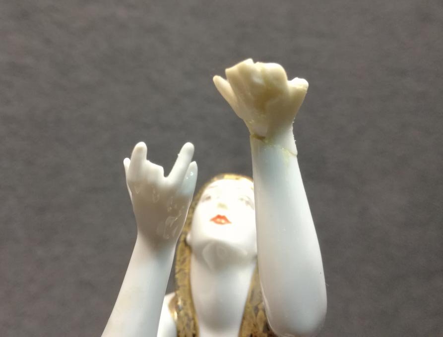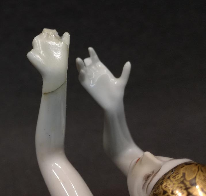 Restaurierungsobjekt; Oberkörper ein mal gebrochen, geklebt. Die linke Hand geklebt und die Finger der linken Hand beschädigt. An der rechten Hand ein Finger beschädigt. Alle Reparaturen unfachmännisch. Bitte dazu die Fotos ansehen.