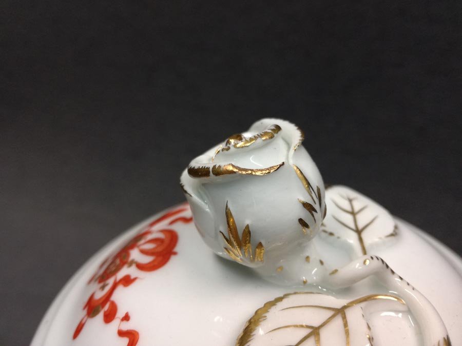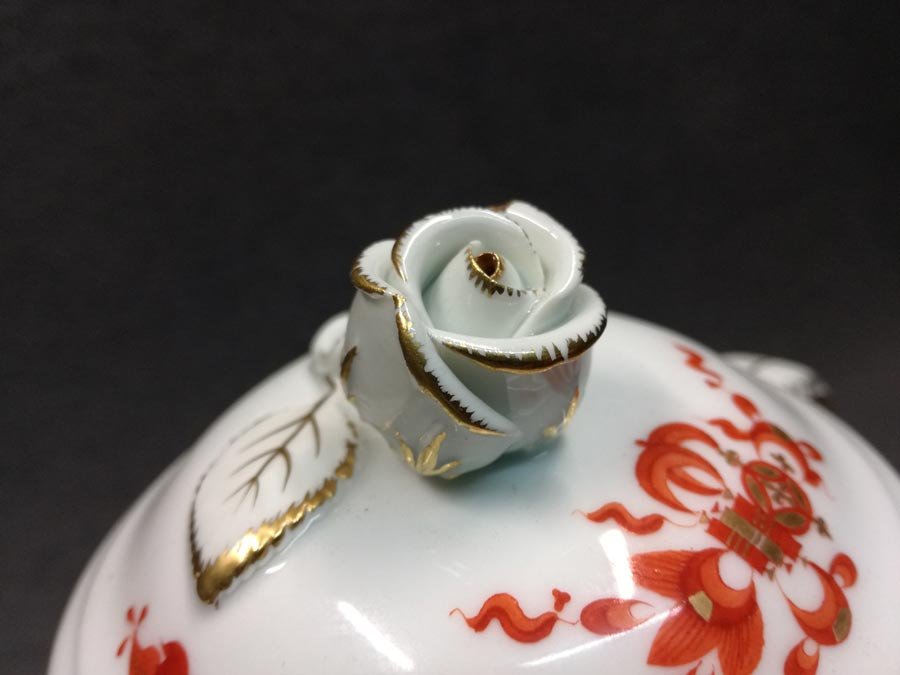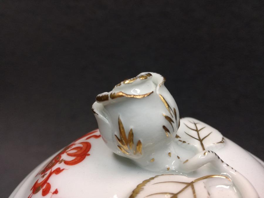Sehr guter Zustand. An der Deckelrose kleine Bestoßung einer Goldkante, diese nachvergoldet (siehe Foto). Des weiteren keine Gebrauchsspuren, keine Chips oder Abplatzer.