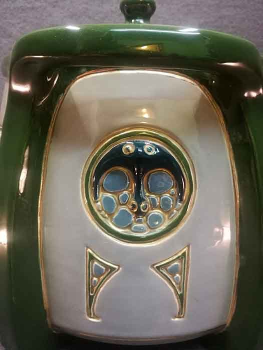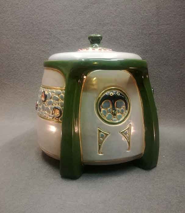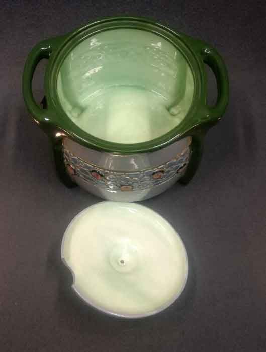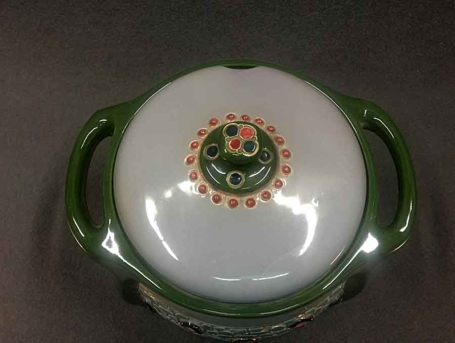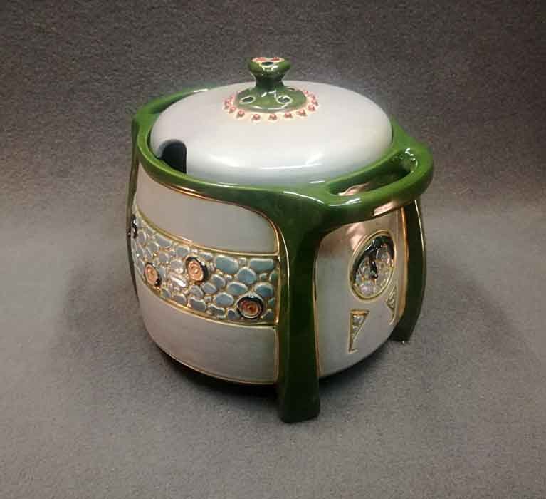Keramik , farbig glasiert. Sehr schöne Jugendstilornamentik und Form.