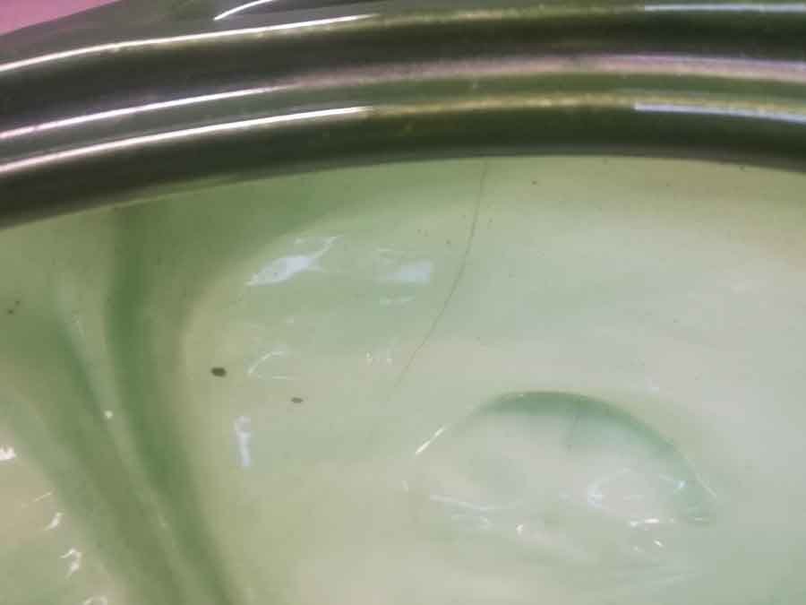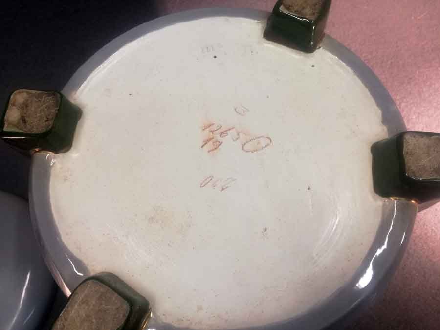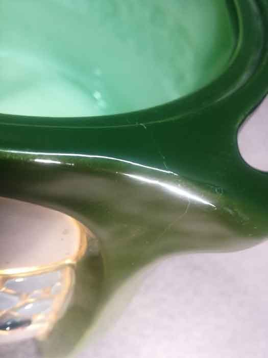 Guter Zustand, es gibt keine Abplatzunge oder Chips. Ansatz eines Henkels mit Haarriss, sowie ein mal seitlich (je Foto). Alle ohne Materialverlust und eher unbedeutend.