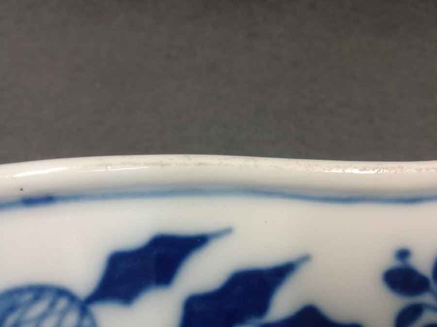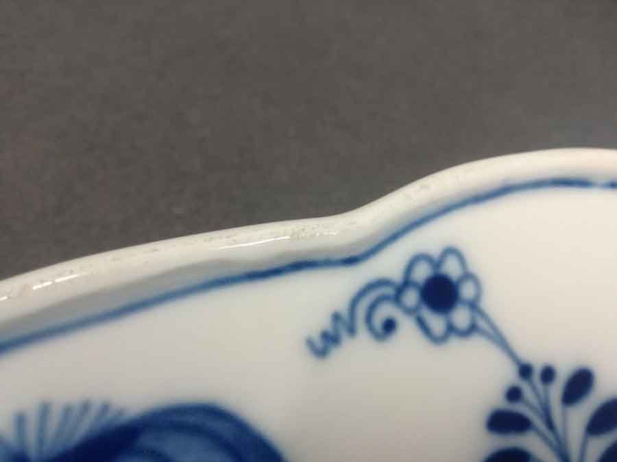 Herstellungsbedingte, zeittypische Glasurunregelmäßigkeiten. Ein kleiner Brandriss am Rand (Foto), z.T. am Rand etwas "rau". Alles herstellungsbedingt, keine nachträglichen Beschädigungen.