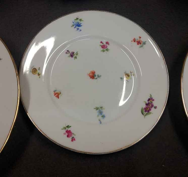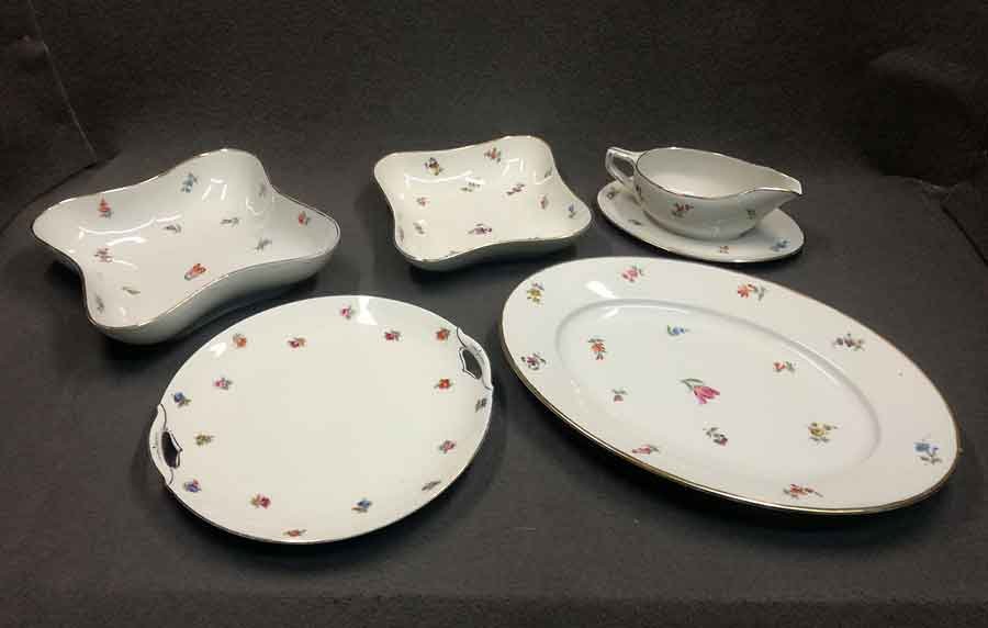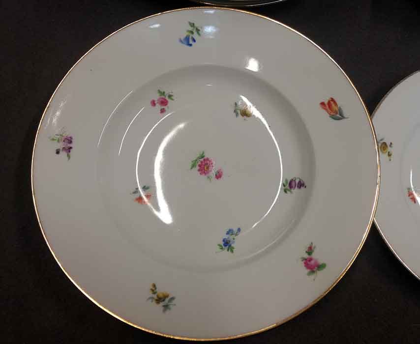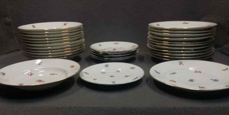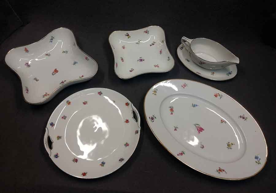 Speiseservice Kästner, Streublümchen, handgemalt mit Goldrand. 37 Teile für 8 bis 12 Personen. Alle Teile in gutem Zustand. Leichter Goldabrieb.