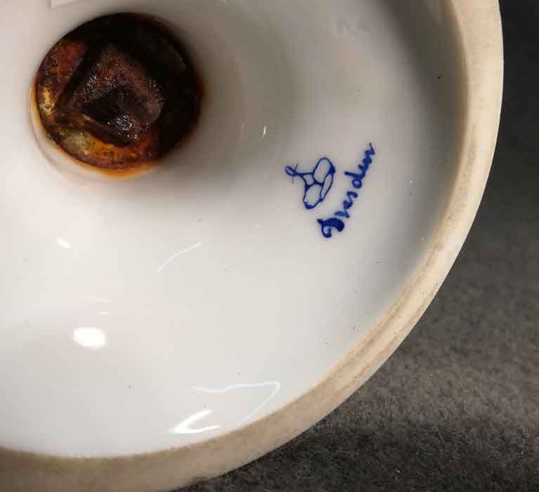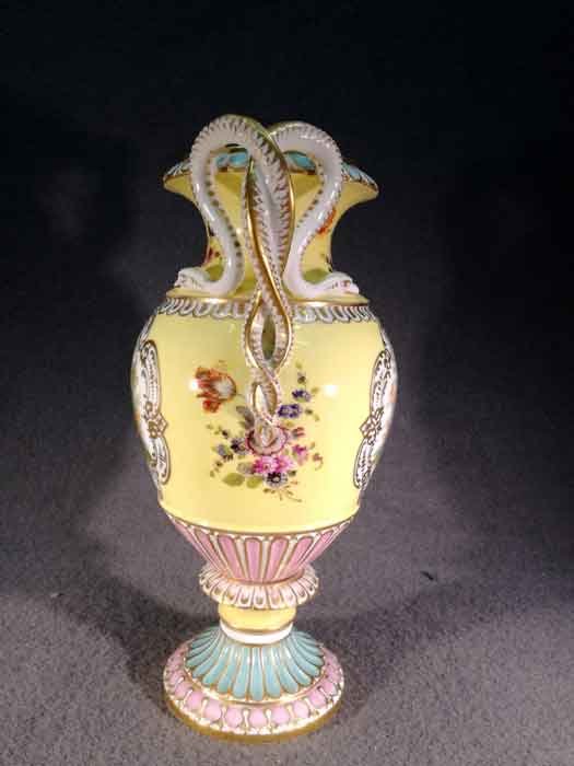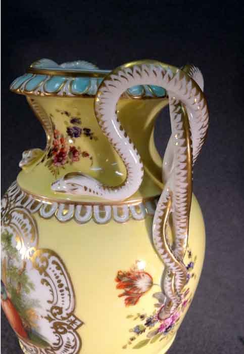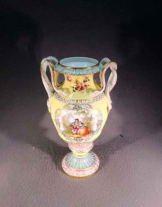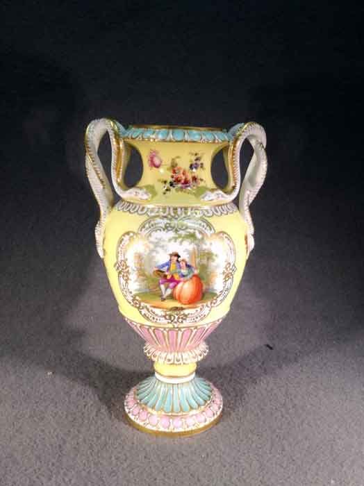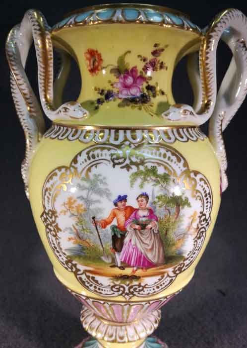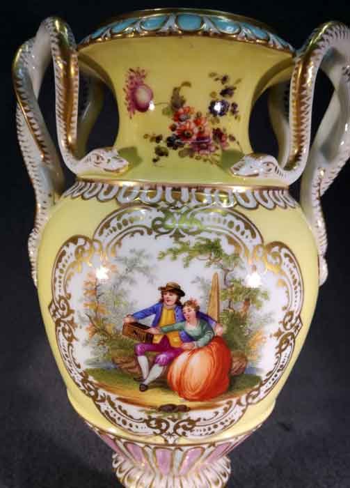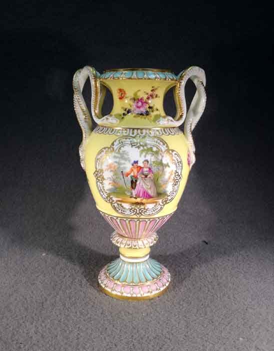 Schlangenhenkelvase, Dresden. Gelber Fond, hell blau und rosa abgesetzt. Beidseitig Watteaumalerei in golden abgesetzten Rokaillenkartuschen. Ovider Korpus, zwei Handhaben in form von je zwei verschlungenen Schlangen.