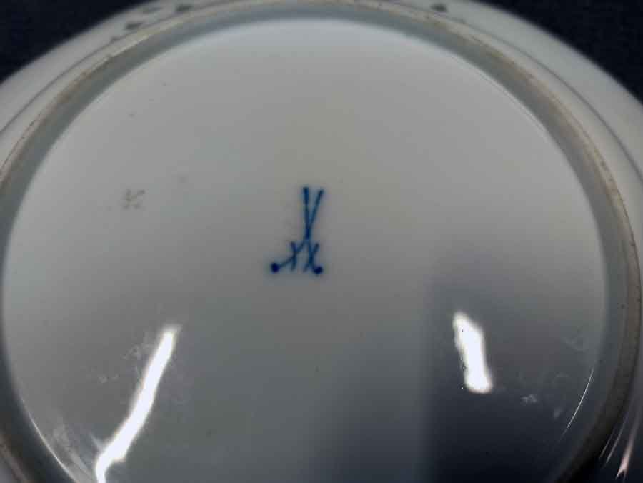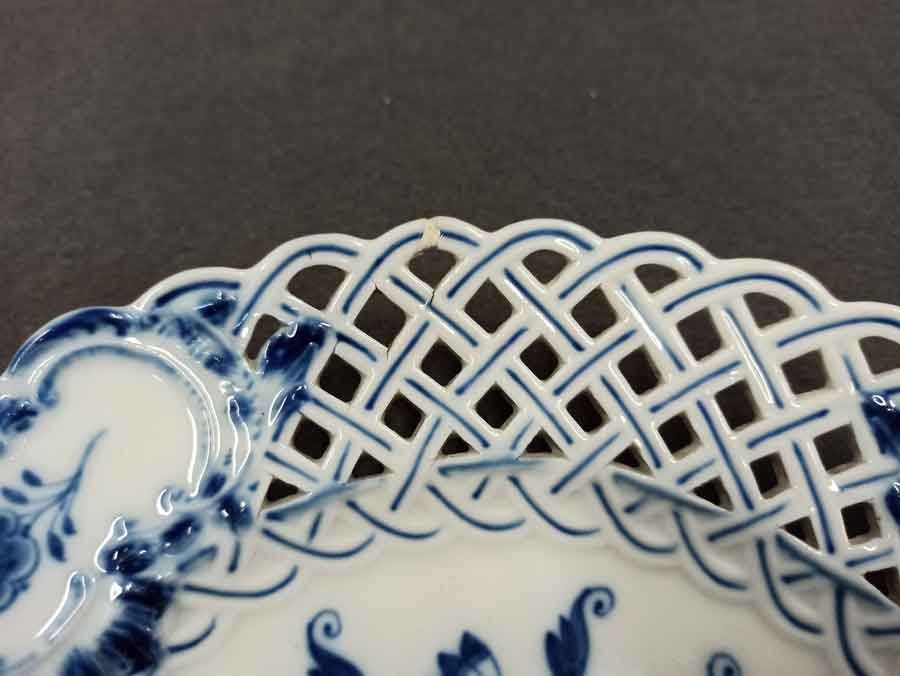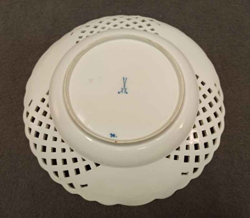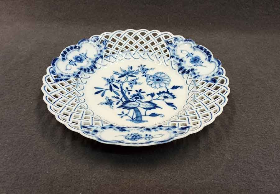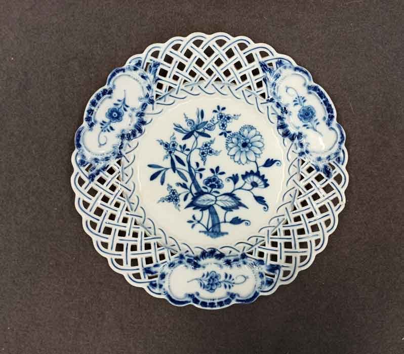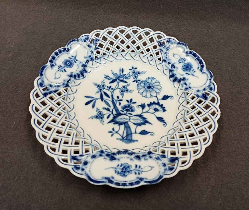 Meissen, alter Teller mit Flechtrand, Zwiebelmuster. Um 1850 bis 1880.