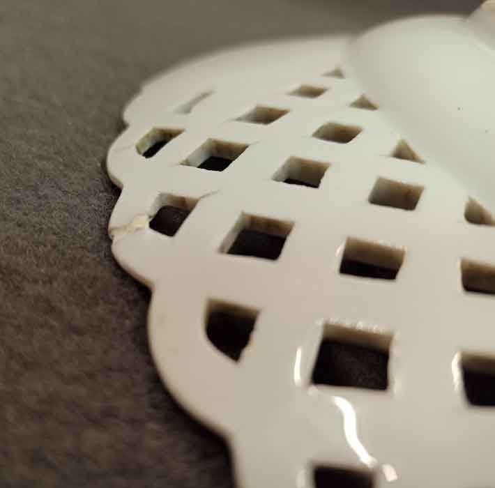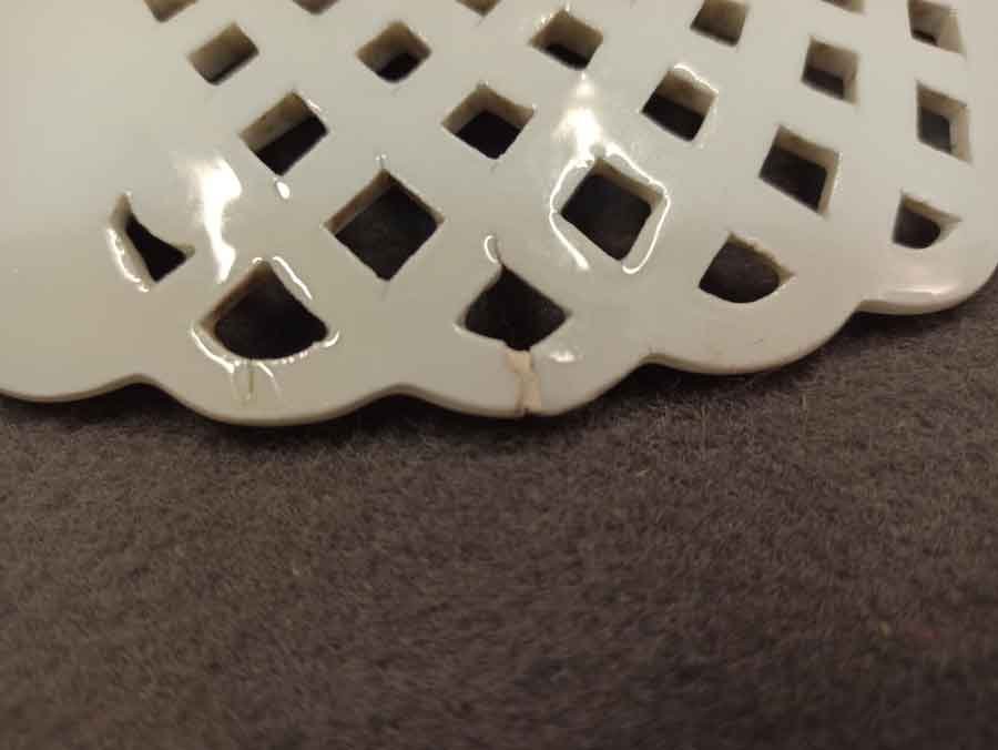 Herstellungsbedingte Brandrisse im Flechtrand, einer alt ausgebessert (siehe Fotos). Sonst sehr guter Zustand keine nachträglichen Beschädigungen, keine Risse Chips oder Abplatzer.