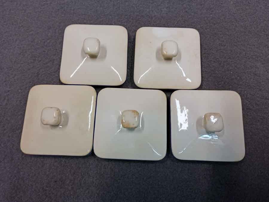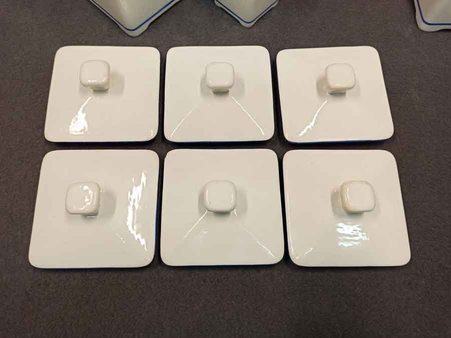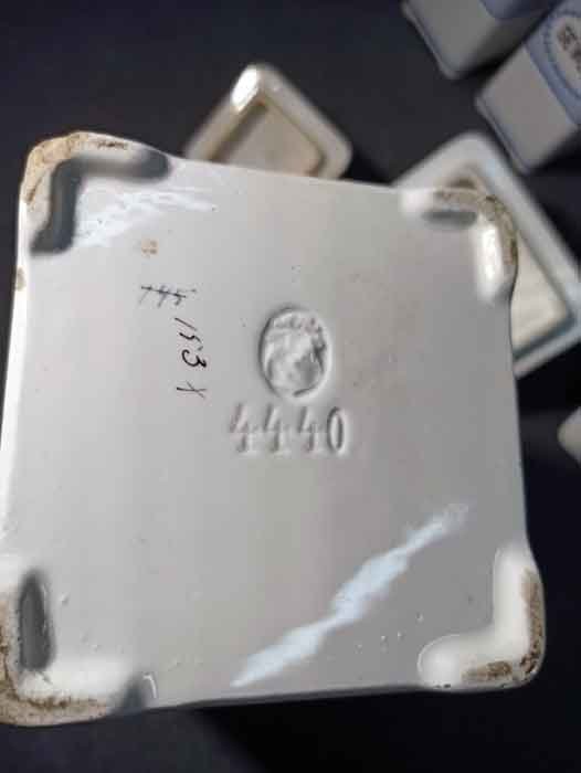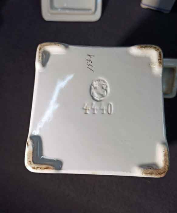 Der Zustand ist gut. An zwei kleinen Gefäßen Glasurverfärbungen im oberen Bereich. Die kleinen Deckel z.T. mit Verfärbung. Die großen Dosen und Deckel weitgehend i.O. An zwei Deckeln gibt es an der Unterseite je Abplatzer.