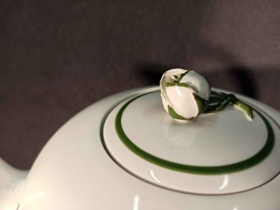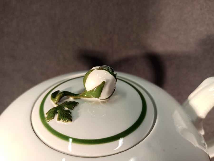1. Wahl. Sehr gut erhalten, keine Beschädigungen, keine Risse, Chips oder Abplatzer an der Kanne. Deckelrose gechippt.