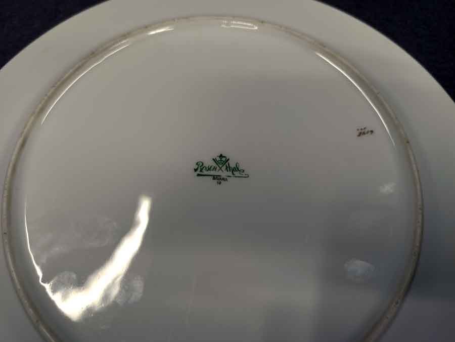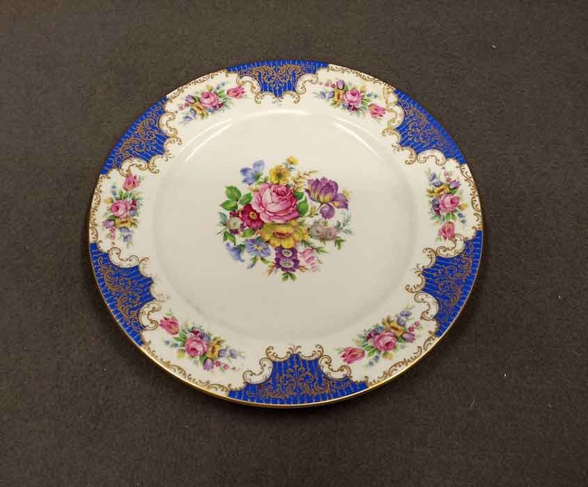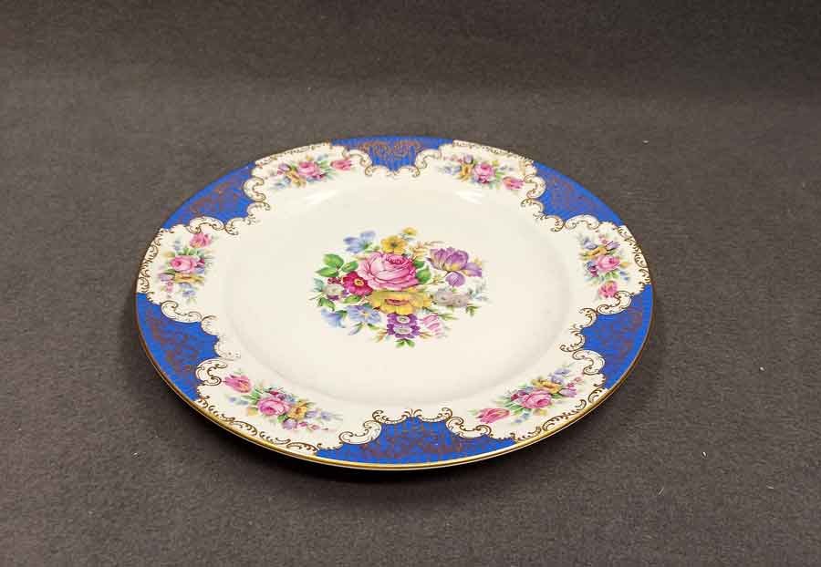 Rosenthal, Zierteller mit reichem Blumenbukett. Auf der Fahne kleine Buketts zwischen blauen Feldern rokaillenartig mit Gold abgesetzt.