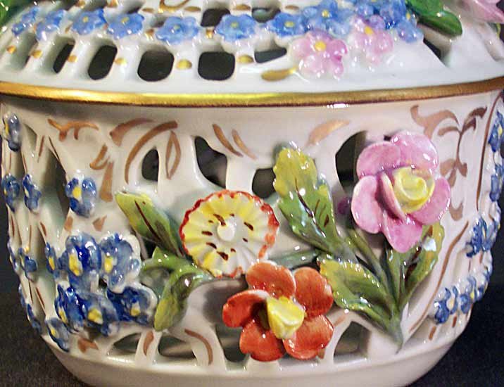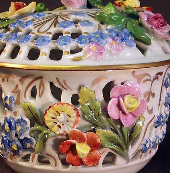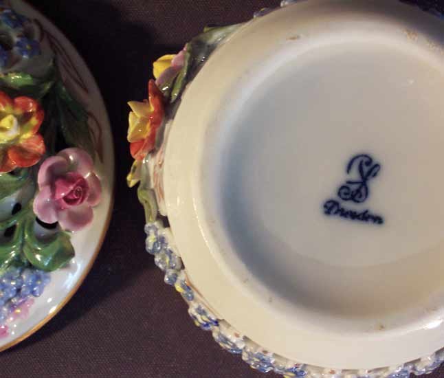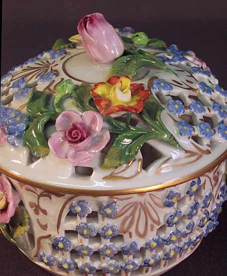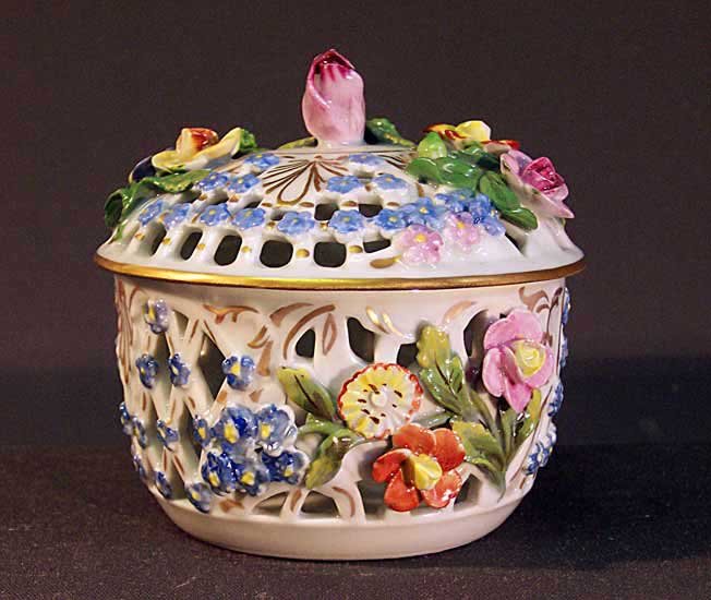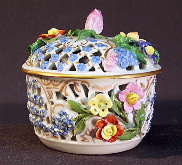 Nicht mehr verfügbar!! Zierdose der Sächsischen Porzellanmanufaktur Dresden.Gitterdose, geflochten,durchbrochene Wandung und Deckel. Reicher, plastischer Blütenbesatz. Aufwändige Arbeit, tadelloser Zustand, keine Beschädigungen, keine Risse, Chips oder Abplatzer; alle Blütenblätter i.O. Neupreis zur Zeit im SP Manufaktur Laden ca 675,- Euro. H. ca 7,5 cm, D. ca 7,5 cm