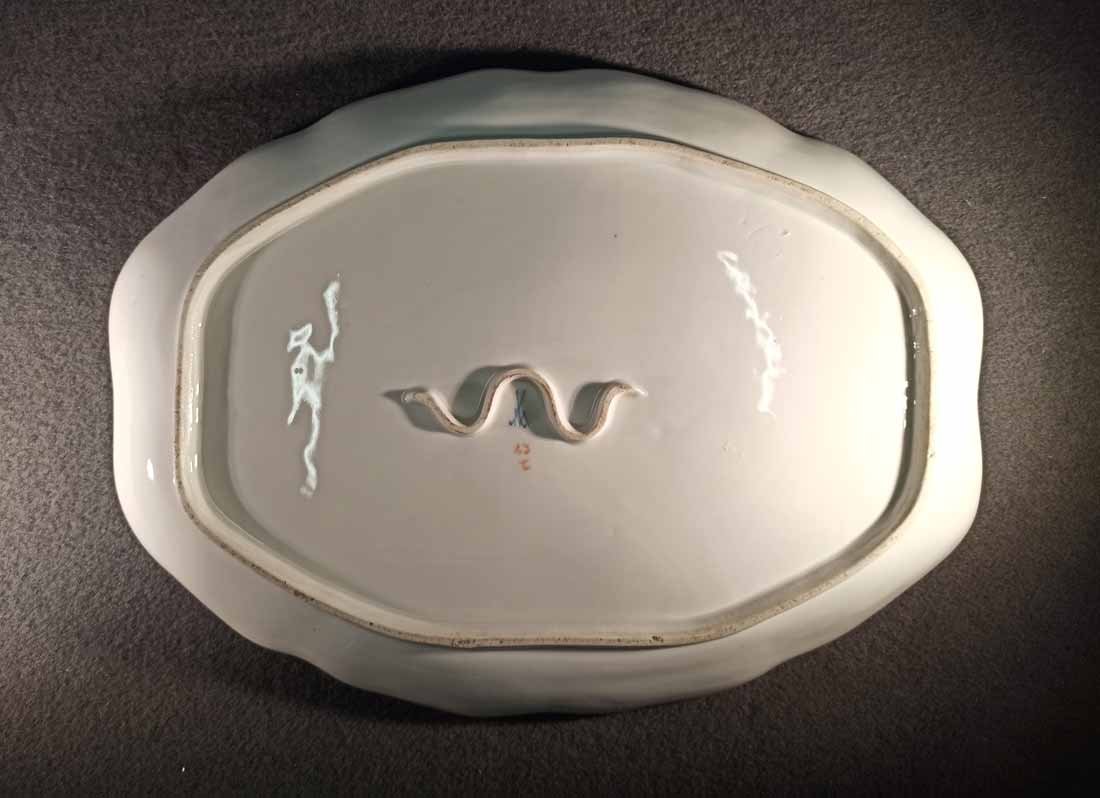 L. 35,5 cmx B. 26,5 cm, H. 4cm. Zustand ohne Beschädigungen, mit Gebrauchsspuren und Glasurmängeln. Am Rand minimale Reste alter Vergoldung.