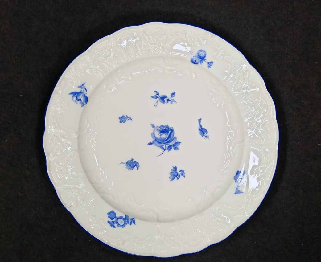 Meissen um 1860 - 1900, seltener Speiseteller mit Reliefzierrat, Blumenmalerei in Blau mit blauem Rand.